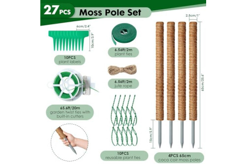 Super Value Set: The 27pcs moss poles set includes 4pcs 65cm plant poles, 10pcs plant labels, 20m of garden twist ties with built-in cutters, 2m of jute rope, 2m plant ties and 10pcs reusable plant ties