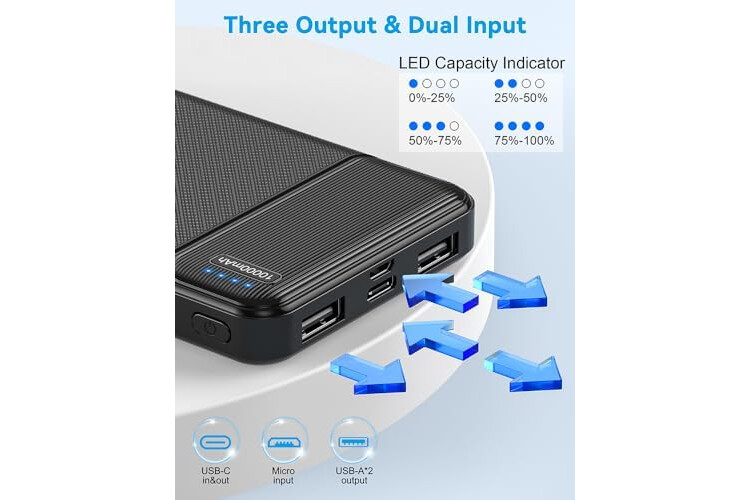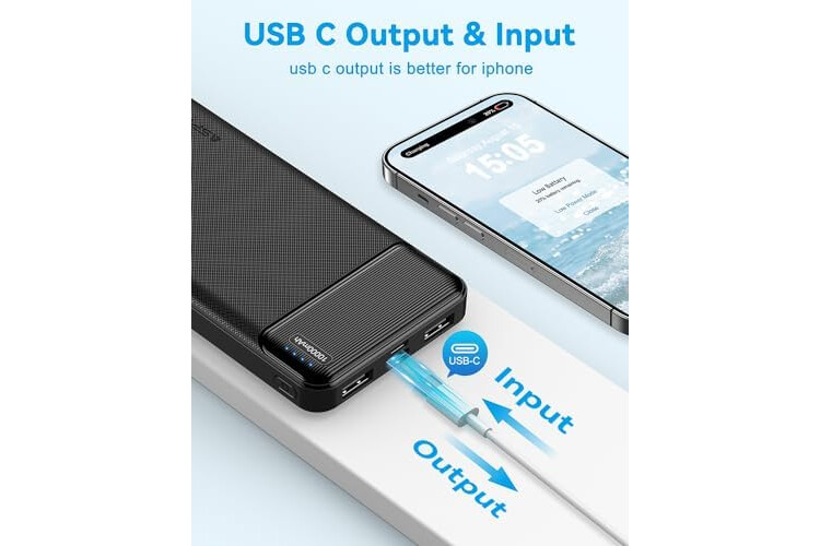 【USB C Input & Output】Upgrade portable battery charger has a USB-C In & Out port to perfectly fit your new iPhones, iPad and all upcoming USB-C devices. Also configured two USB-A output ports that recognize all connected devices and distribute load up to 5V 2.4A effectively. Therefore our phone battery power bank can work with not only all the phones, tablets but your smaller devices like AirPods, Bluetooth headphones, fitness trackers, smart watches, heated vest etc.
