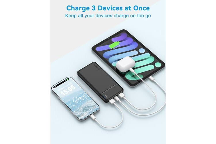 【Charge THREE at Once】 With one USB-C port and two USB ports built-in, it can juice up THREE devices simultaneously. Triple-port design allows you to share portable power with families and friends.
