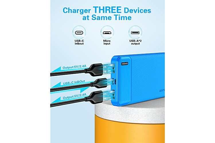 【Charge THREE at Once】 With one USB-C port and two USB ports built-in, it can juice up THREE devices simultaneously. Triple-port design allows you to share portable power with families and friends.