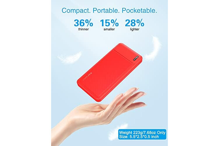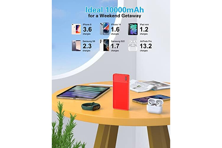 【10000mAh Power Bank Pack of 2】 These two 10000mAh portable chargers are small enough to go into any pocket or backpack. These battery packs are powerful enough to last the entire day. Each one charges the iPhone X 2.4 times, the iPhone 8 3.6 times, and the Samsung Galaxy S9 2.2 times.