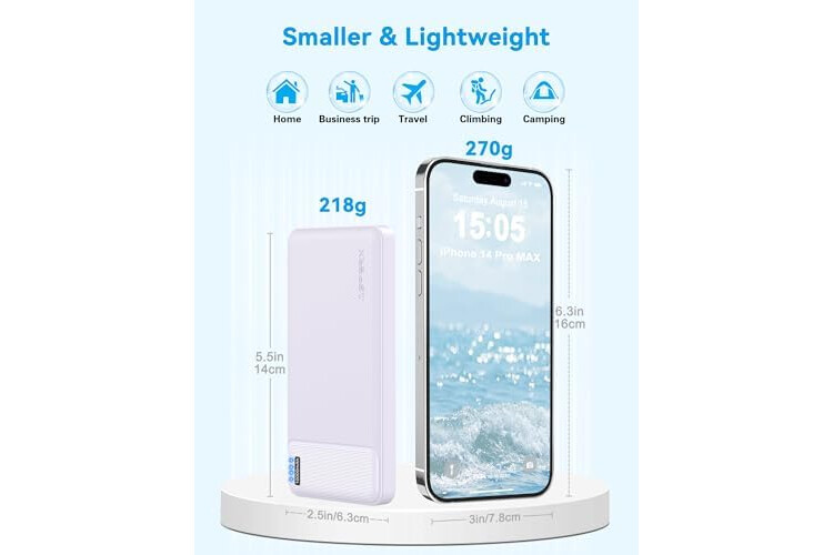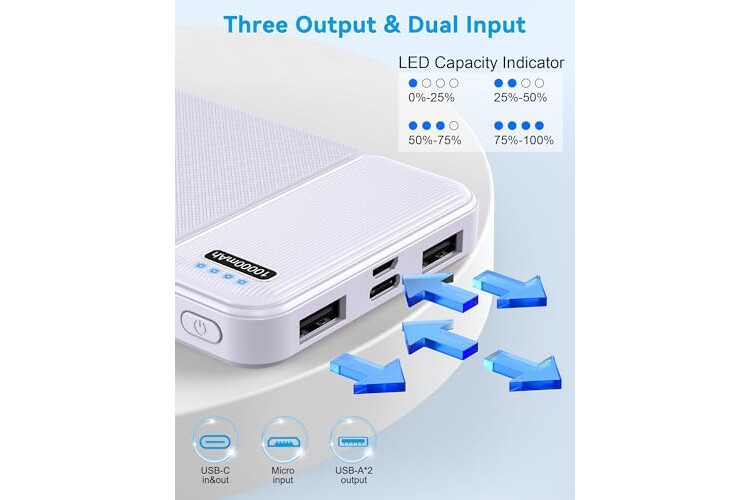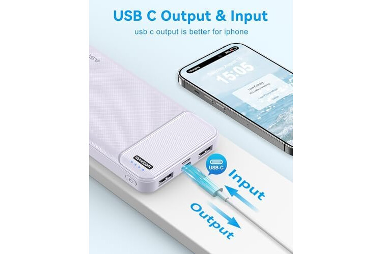 【USB C Input & Output】Upgrade portable battery charger has a USB-C In & Out port to perfectly fit your new iPhones, iPad and all upcoming USB-C devices. Also configured two USB-A output ports that recognize all connected devices and distribute load up to 5V 2.4A effectively. Therefore our phone battery power bank can work with not only all the phones, tablets but your smaller devices like AirPods, Bluetooth headphones, fitness trackers, smart watches, heated vest etc.