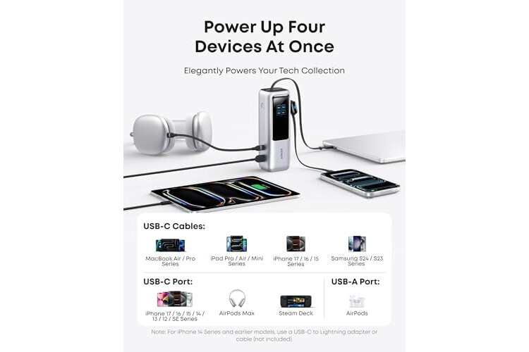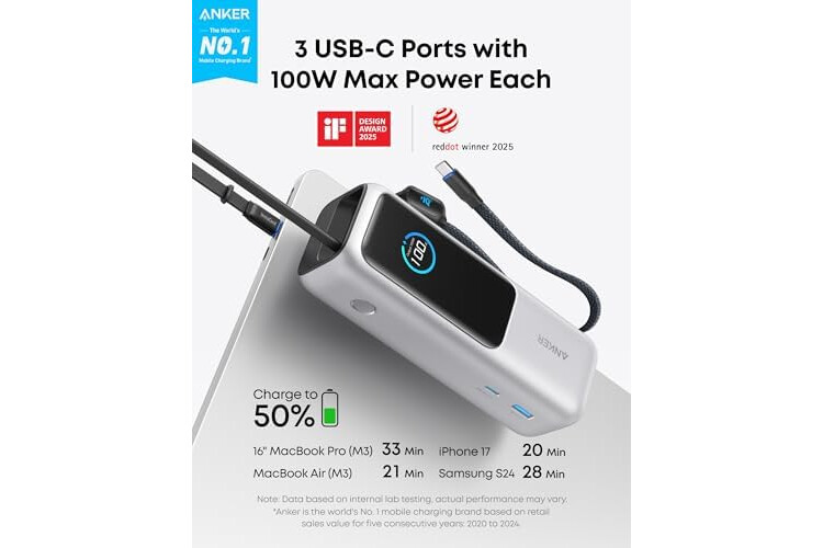 Anker Laptop Power Bank, 25,000mAh Portable Charger with Triple 100W USB-C Ports for Multi-Device Charging, Built-In and Retractable Cables, For iPhone 16/15 Series, Samsung (Charger not included)