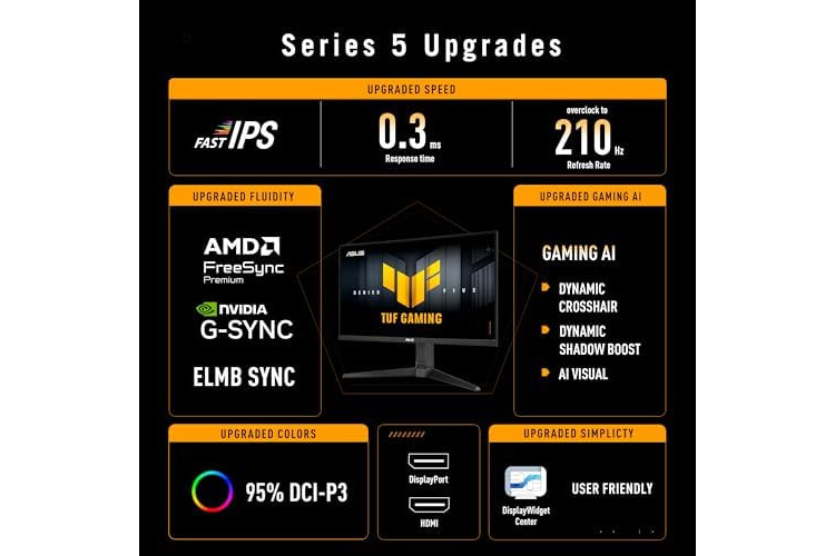 ASUS TUF Gaming Series 5 - VG27AQL5A Gaming Monitor – 27-inch, QHD(2560x1440), 210Hz(OC), Fast IPS, ELMB SYNC, 0.3ms GTG (min.), Stereo speaker, DisplayWidget Center, Gaming AI, Height Adjustment
