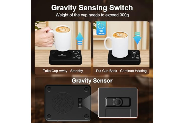 【Smart Cup Warmer with Gravity Sensor】This mug warmer adopts the gravity induction technology. It has a microgravity sensor switchat the bottom. After plug in the power and turn on the switch button, put the cup on the coffee warmer it will heat automatically. Take away the cup and it stop heating and enter the standby mode. If the cup is not put back within 10 minutes, the coffee warmer will automatically shut down.