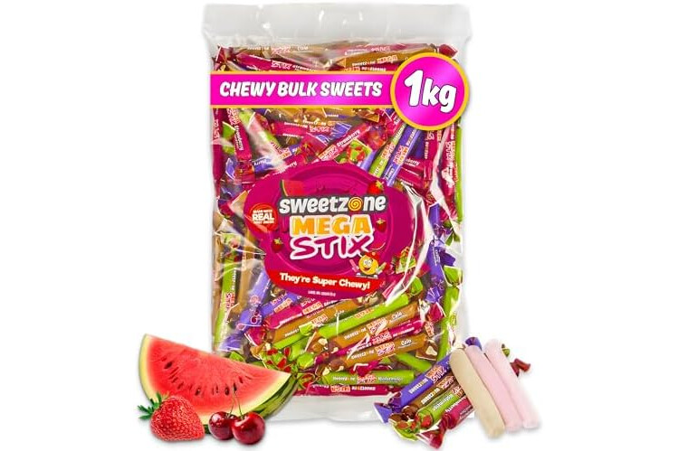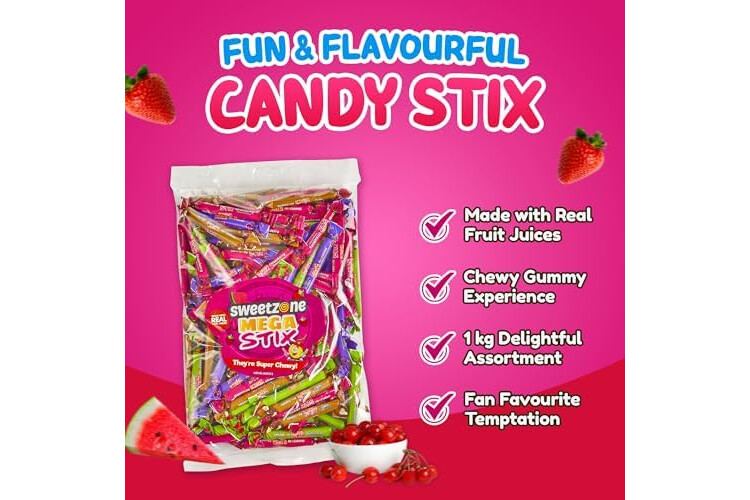 Sweetzone Mega Stix, 1kg Assorted Fruity Flavours Bag of Sweets - Enjoy the Burst of Real Fruit Juices with these Chewy Sweets Fruity Treats Sticks - Halal Candies, Perfect for Kids and Candy Lovers