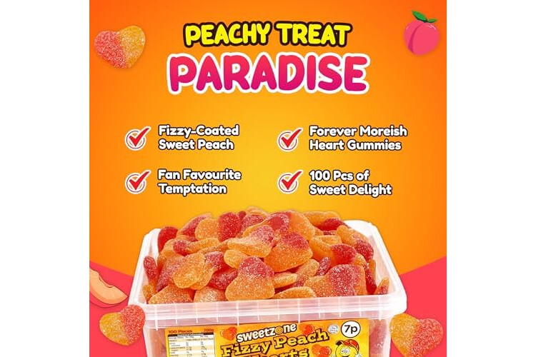 🍬🎉 Halal Goodness: Enjoy peace of mind with these halal peach hearts. A great addition to your sweets tub, they cater to diverse dietary needs while delivering that irresistible fizzy flavour.