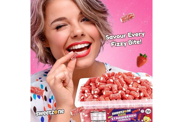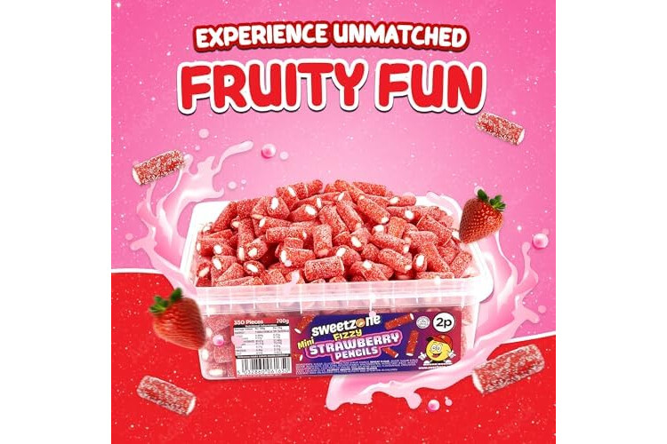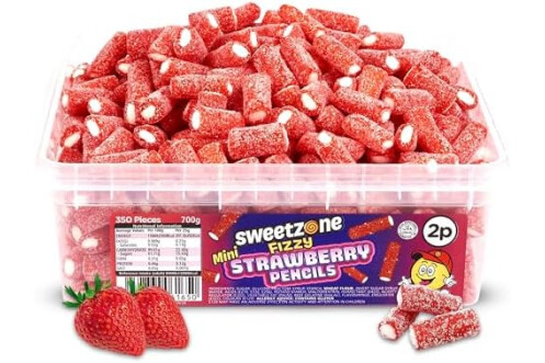 Sweetzone Mini Fizzy Strawberry Pencils, Retro Sweets Tub, Candy Sticks, 350 pc, 700g, Halal Sweets, Sweet Bulk, Sweet Cart, Gummy Candies, American Candy, UK British Candies
