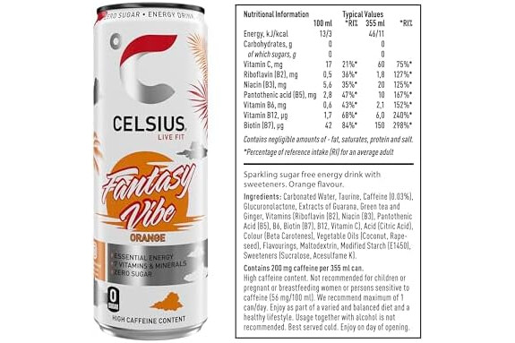 | Manufacturer contact | Manufactured in the EU for Celsius Holding Inc. Distributed by LR Suntory: LRS Stockley Park, Uxbridge, UB11 1BA, UK 800 085 71 |