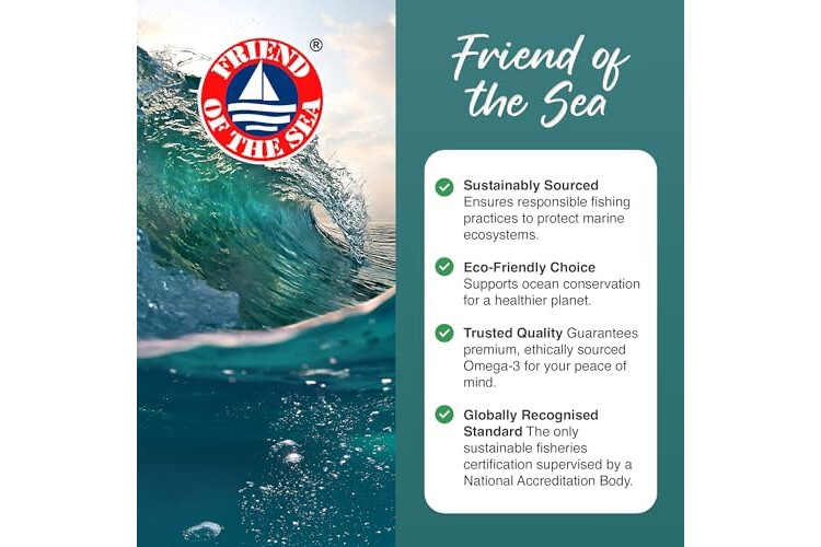Friend of the Sea Certified: Our Omega 3 fish oil capsules are Friend of the Sea certified, ensuring it is responsibly sourced with sustainable fishing practices. Unlike many fish oil capsules, we prioritise both quality and environmental responsibility.