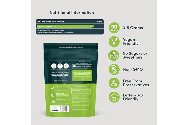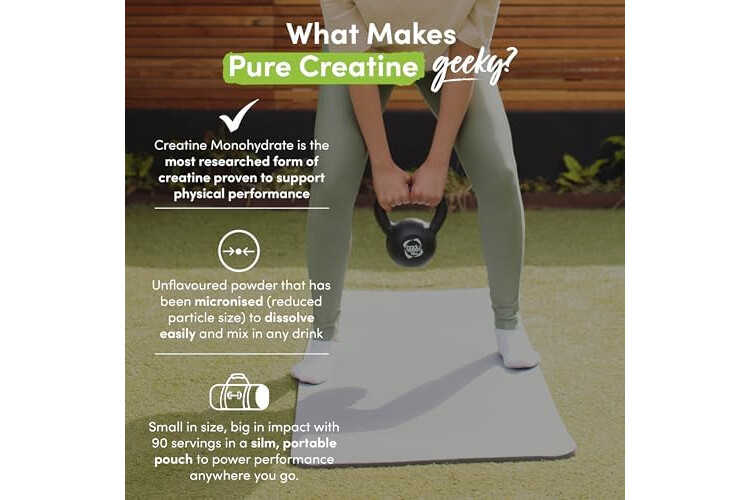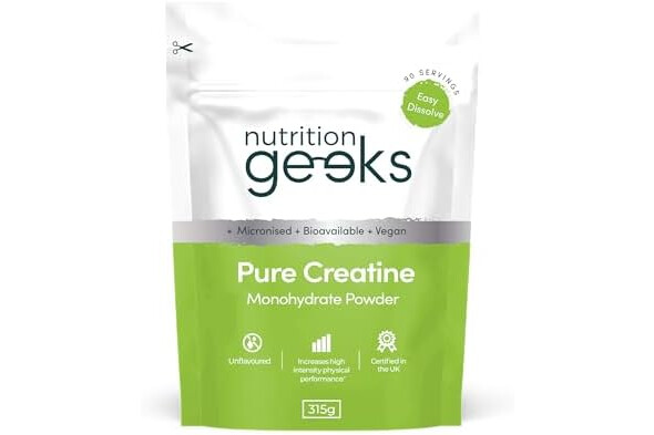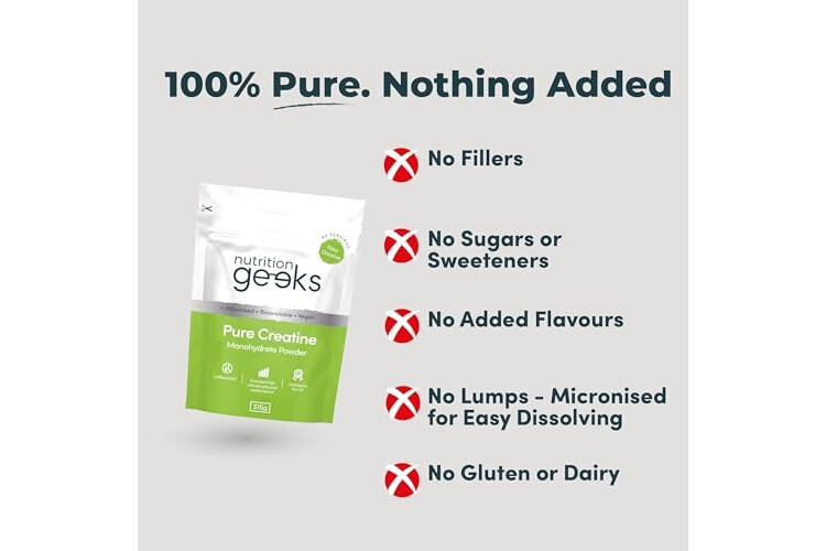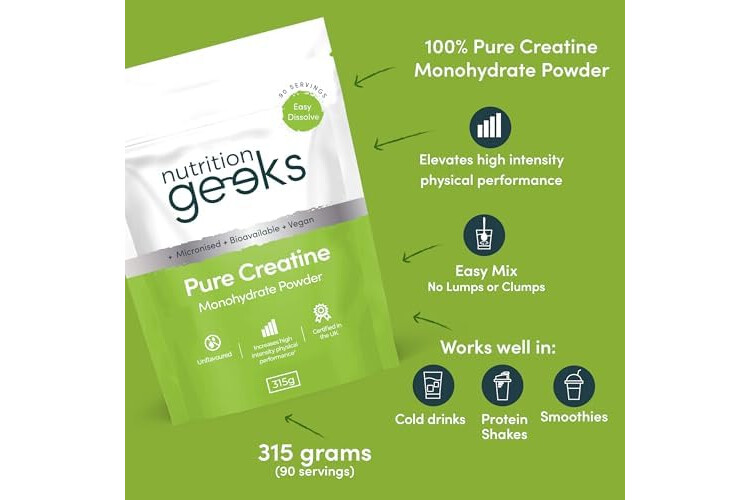 Why Choose Nutrition Geeks Creatine Powder: Get 315g (3 month supply) of pure unflavoured micronized creatine powder which is easy to dissolve and proven to work.
