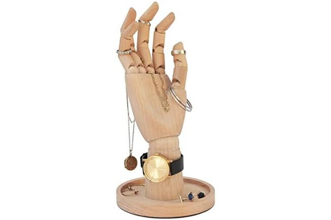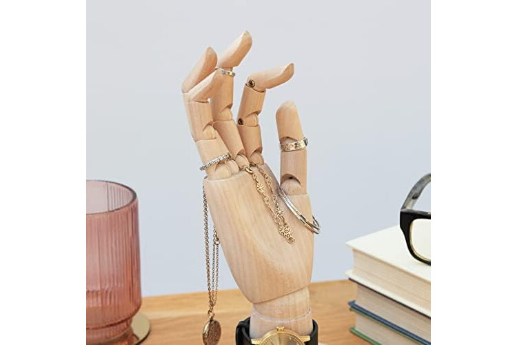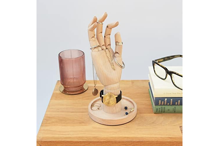 HAND WOODEN JEWELLERY ORGANISER - Stunning mannequin-inspired jewelery stand features realistic hand design with moveable joints that displays rings, necklaces and bracelets while serving as artistic home decor centerpiece perfect for bedroom accessories and dressing table organization.