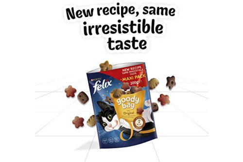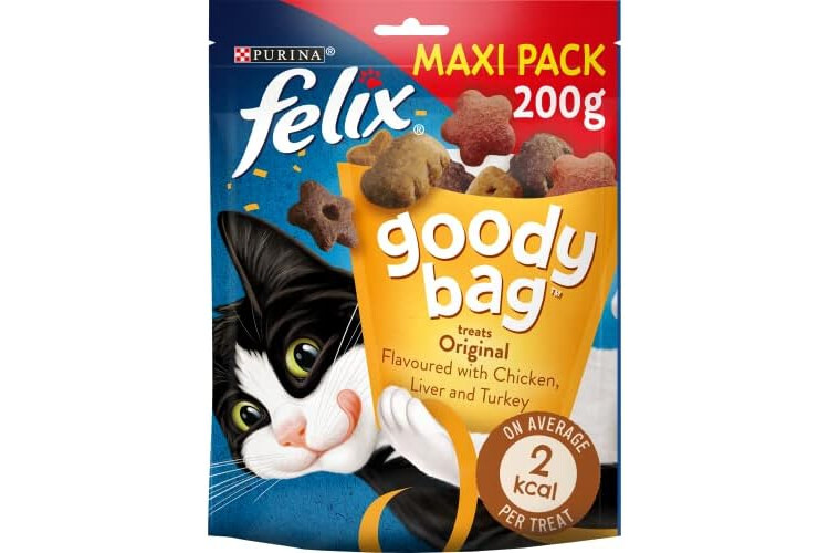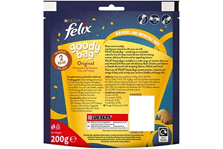 Our specially formulated FELIX GOODY BAG Original Mix flavoured with Chicken, Liver & Turkey cat treats contain proteins, vitamins and omega 6 fatty acids to help keep your cat supported.