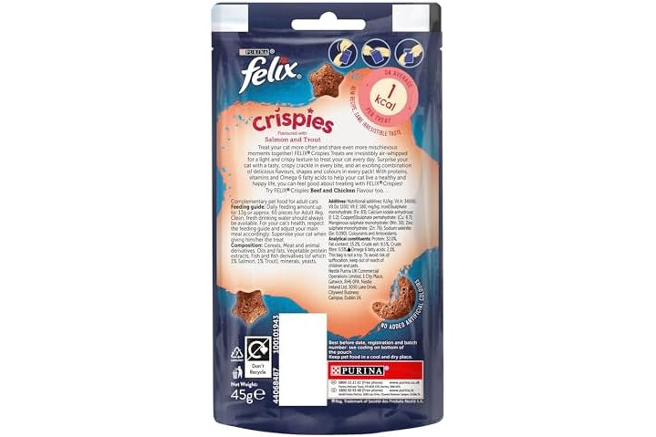 • With Proteins, Vitamins and Omega 6 fatty acids to help your cat live a healthy and happy life, you can feel good about treating with FELIX Crispies