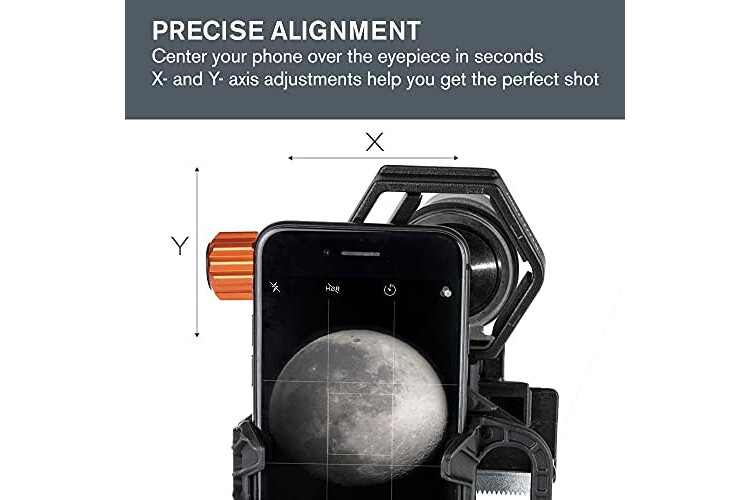 2-DIRECTIONAL RACK AND PINION ALIGNMENT: NexGO features two directional knobs (X & Y axis) with tension adjustments that perfectly align your phone’s camera with the eyepiece in seconds