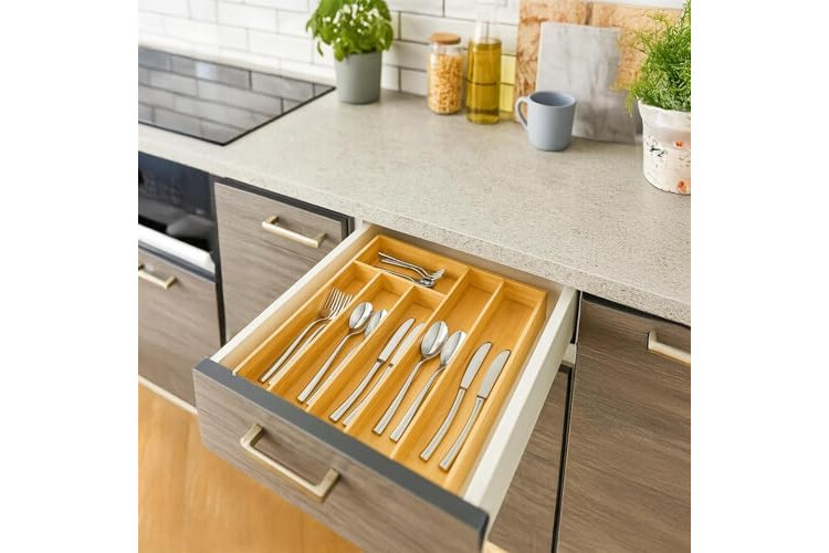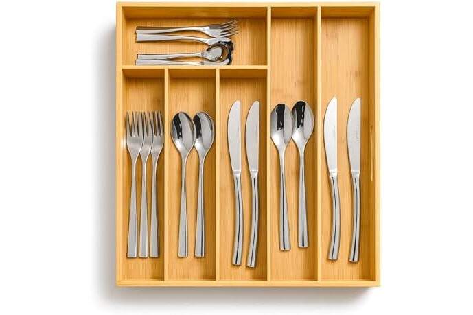 PREMIUM NATURAL BAMBOO CUTLERY TRAY: Crafted from eco-friendly, durable bamboo that is scratch-resistant and built for daily kitchen use. Designed to fit most standard kitchen drawers while keeping utensils neatly arranged.