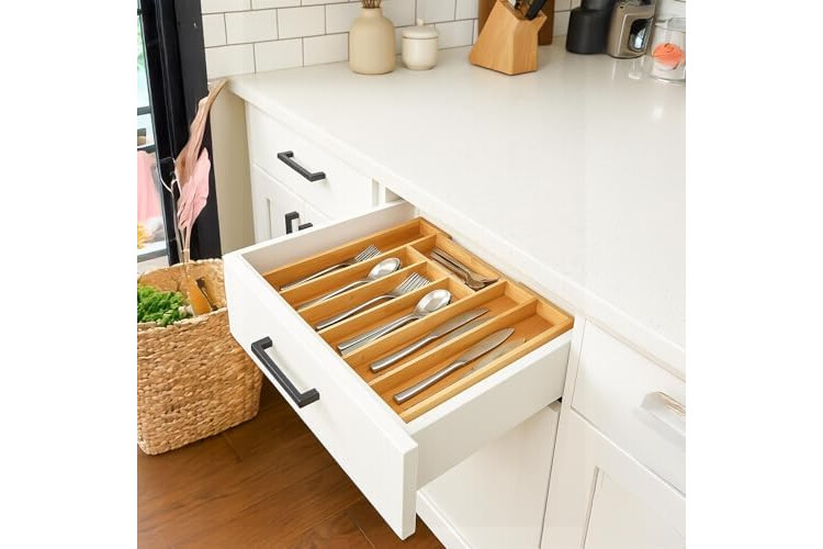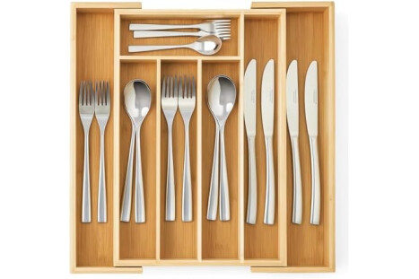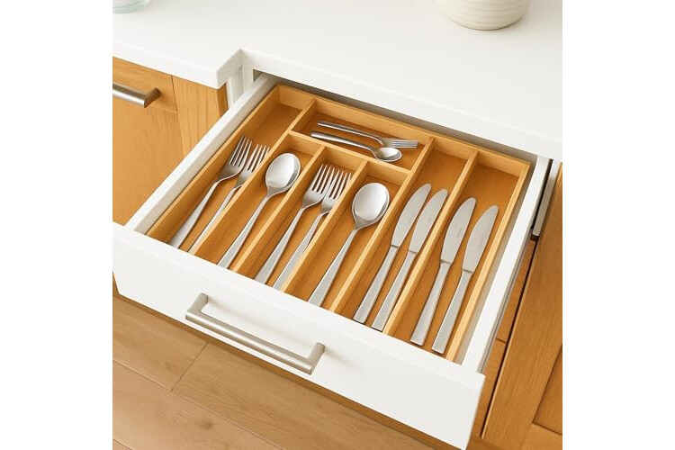 ADJUSTABLE BAMBOO CUTLERY TRAY (5–7 COMPARTMENTS): Made from 100% natural bamboo, the drawer organiser expands to fit most standard kitchen drawers. Adjustable compartments keep knives, forks, spoons and utensils neatly separated and easy to access.