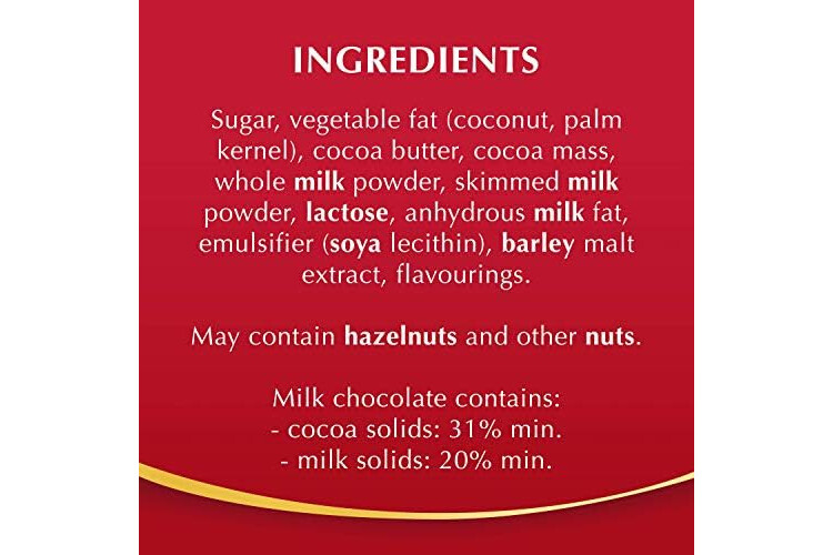 Sugar, Vegetable Fat (Coconut, Palm Kernel), Cocoa Butter, Cocoa Mass, Whole MILK Powder, Skimmed MILK Powder, Lactose, Anhydrous MILK Fat, Emulsifier (SOYA Lecithin), BARLEY Malt Extract, Flavourings, MILK Chocolate contains - Cocoa solids: 31% minimum, MILK Solids: 20% minimum.May contain hazelnuts and other nuts. May contain other nuts.