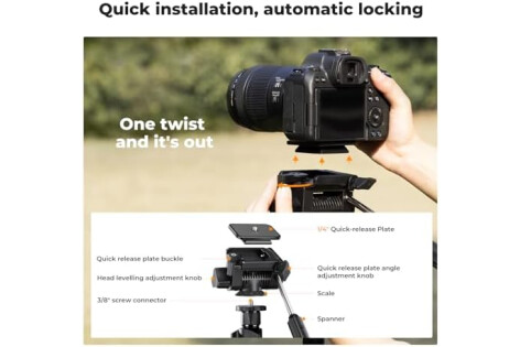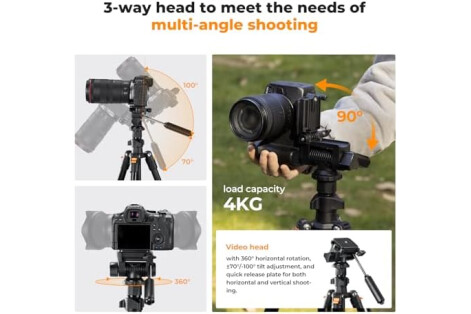 【3-Way Swivel Pan Head&Quick Release Plate】360-degree panoramic rotation allows you to take photos at any angle in horizontal and vertical directions; With standard 1/4" screw mount compatible for all digital cameras, most camcorders, GoPro devices, binocular, telescopes etc.