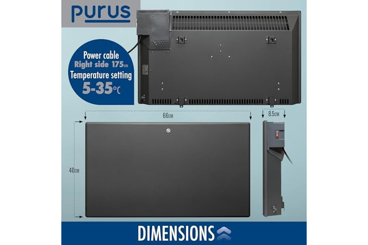 Simple Installation: The Purus grey electric heater can be installed on any standard home building wall, it can also be floor standing due to the feet supplied. Power Cable size 1.75m (cable located on the right side of the heater). Product Dimensions: L 66cm x D 8.5cm x H 40cm Approx, H 45cm when floor standing, Lightweight at only 4kgs and comes with a standard UK 3 pin 13 amp power plug.