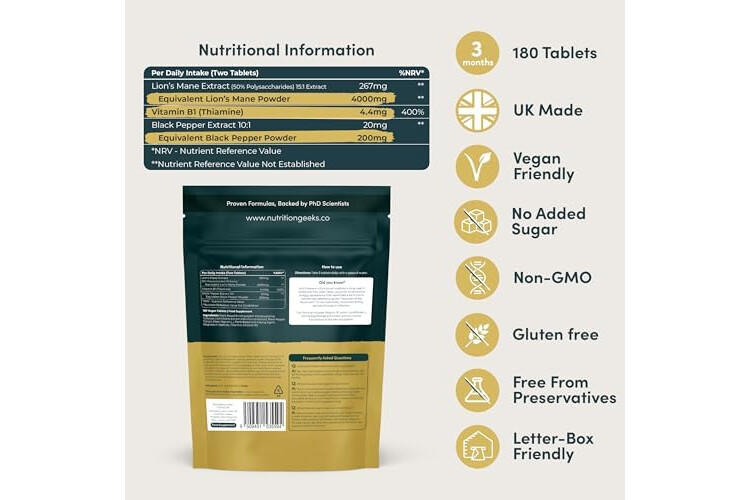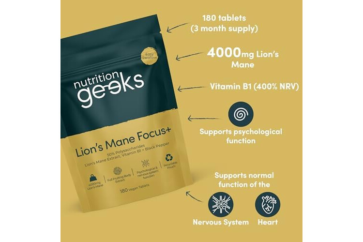 Lions Mane Supplement 4000mg with Vitamin B1 & Black Pepper, 180 Vegan Tablets - Lion's Mane Mushroom 15:1 Extract (Not Lions Mane Powder or Capsules), UK Made for Mental Performance & Nervous System