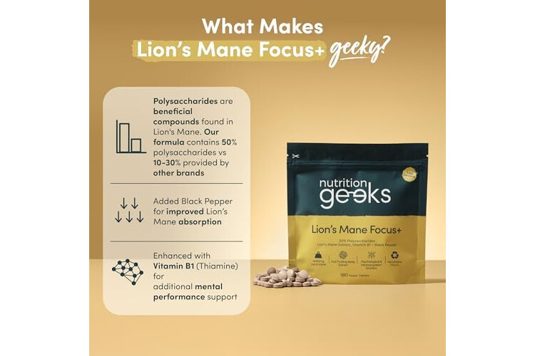 Why Buy Lion's Mane Focus+ : You get a science-backed Lion's Mane supplement using industry leading 50% polysaccharides, the main beneficial compounds in Lions Mane. Our Formula is enhanced with Vitamin B1 for additional mental performance support and Black Pepper to aid absorption of lion's mane extract.