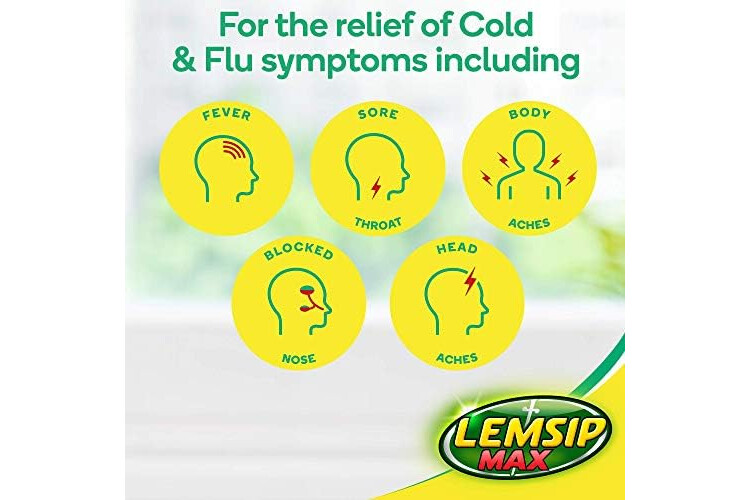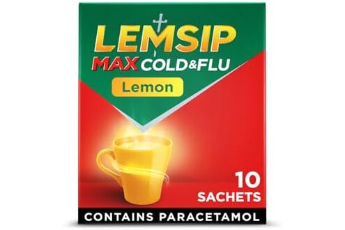 Lemsip Max Cold and Flu, Lemon, 10 Sachets, Paracetamol, Headache Relief, Sore Throat Relief, Nasal Congestion Relief, Max Strength, Fast-Acting, Medication