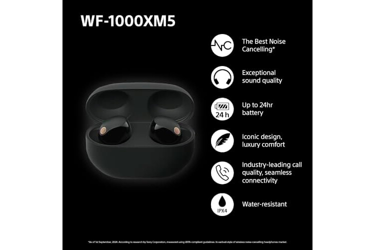 Sony WF-1000XM5 Wireless Noise Cancelling Earbuds, Bluetooth, In-ear Headphones, Mic, Up to 24 Hours Battery Life, Quick Charge, IPX4, iOS & Android Compatible - Black