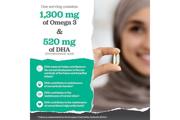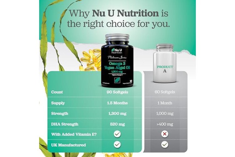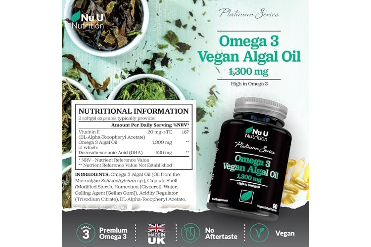 1300MG OF OMEGA 3 RICH ALGAL OIL PER SERVING - Our softgels are packed with 1300mg of premium Vegan Omega 3 rich Algal Oil per serving, providing a higher dosage per capsule than you will find in many other algae Omega 3. One serving provides 520mg of DHA which contributes to the normal function of the heart and supports normal vision and brain function. Our formula also contains the antioxidant Vitamin E which is added to ensure the oil remains fresh so you receive its full benefits.