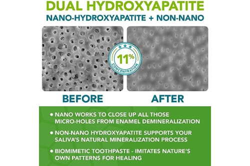ENAMEL REPAIR TOOTHPASTE WITH HYDROXYAPATITE: Hydroxyapatite is a naturally occurring form of calcium that forms over 90% of a tooth’s enamel. Thanks to its ability to fill in and repair enamel damage, it is great for a remineralizing toothpaste. Plus, as hydroxyapatite is pure white, it adds gentle and non-abrasive whitening to your teeth. With a high concentration of two forms of hydroxyapatite, our holistic toothpaste provides superior remineralization and sensitivity relief.