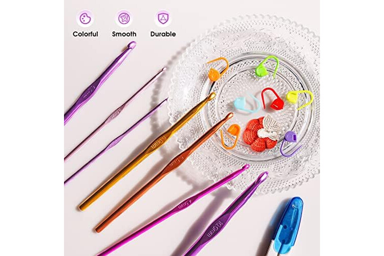 🧶【Smooth and Durable】Our crochet hooks are crafted from high-quality aluminum and finely polished for a smooth and comfortable experience. Each hook features a different color plating for easy size identification.