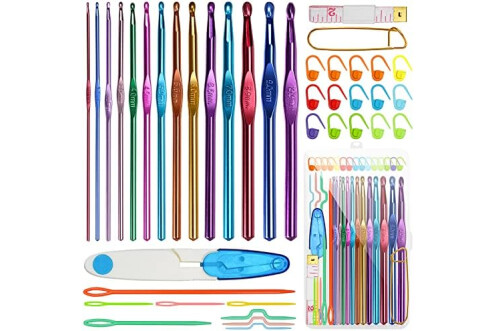 🧶【41pcs Crochet Kit】This ergonomic crochet hooks set includes 14pcs multicolour aluminium hooks in sizes B(2mm) to N(10mm), 15* stitch markers, 5* suture needles, 3 * needles, a pin clip, measuring tape, scissors and a plastic storage case. Everything you need for your crocheting projects in one convenient package.