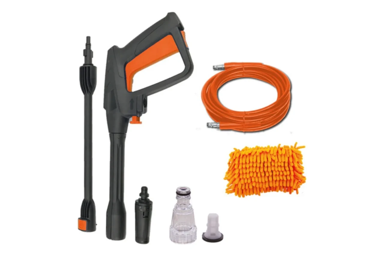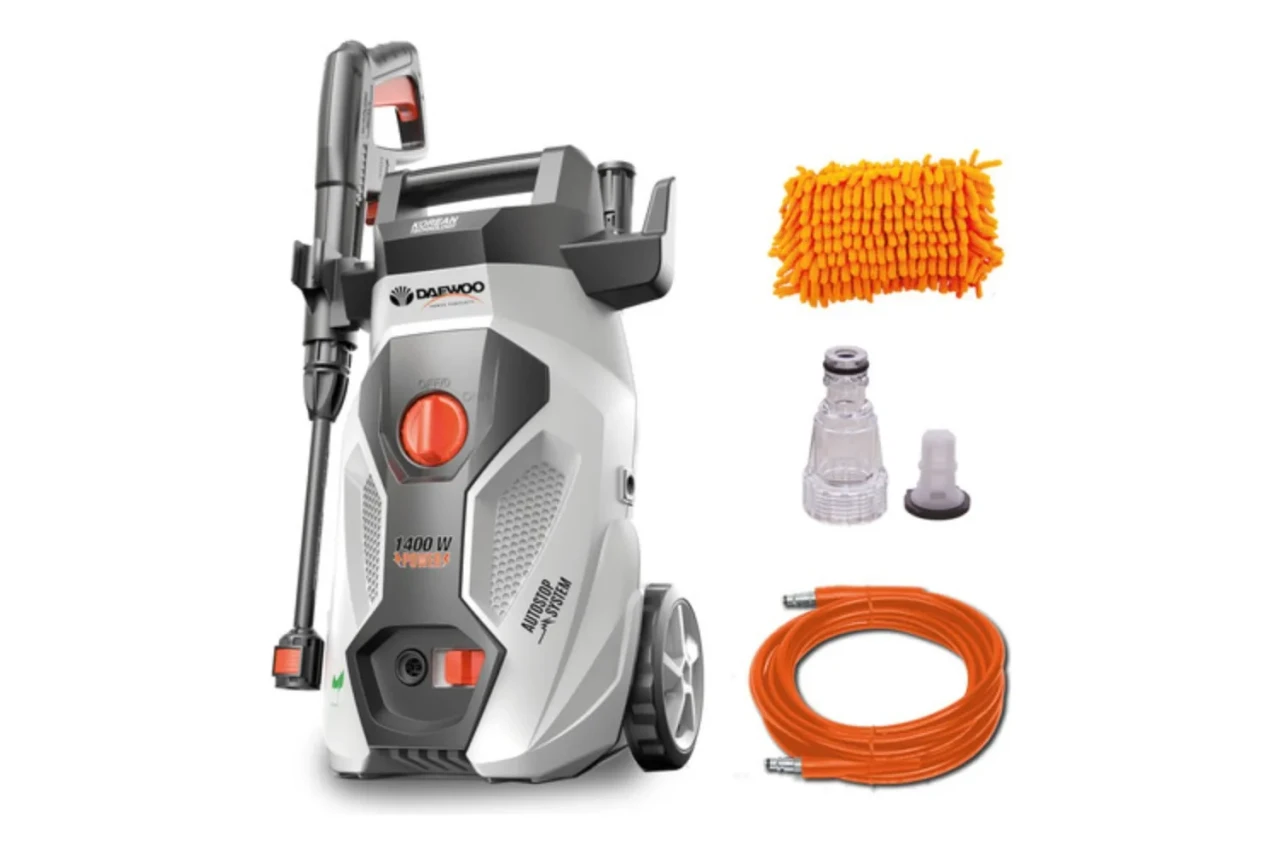 HIDROLAVADORA DAEWOO 1400W DAX105-1400 ¿Necesitas limpiar superficies difíciles de forma rápida y efectiva? Entonces, la hidrolavadora DAEWOO 1400W DAX105-1400 es perfecta para ti. Con una potencia de 1400W y una presión máxima de 105 bar, nuestra hidrolavadora de alta presión es ideal para limpiar coches, bicicletas, suelos y paredes con facilidad. Además, su caudal máximo de 426 lts/h y su temperatura máxima de 50°C te permiten limpiar de manera más eficiente y en menos tiempo. La hidrolavadora DAEWOO 1400W DAX105-1400 también cuenta con un sistema auto-stop que detiene automáticamente la hidrolavadora cuando no estás usando el gatillo de la pistola, lo que ahorra energía y reduce el desgaste de la máquina. En cuanto a la conexión, es muy sencilla, por lo que podrás ponerla en marcha en pocos minutos. Además, viene con accesorios útiles como una botella de detergente, filtro de entrada, limpiador de boquilla, esponja trapeadora y enrollador de manguera. ¡Lleva la hidrolavadora DAEWOO 1400W DAX105-1400 a casa y disfruta de una limpieza más fácil y rápida! DATOS TÉCNICOS: • Potencia: 1400 watts • Alimentación: 220 V/50Hz • Temperatura del agua máxima: 50 ºC • Caudal máximo: 426 L/h • Material de la Bomba: Aluminio • Presión máx. admisible: 10,5 MPa - 105 bar • Longitud del cable de conexión: 3 metros • Longitud de la manguera de alta presión: 3 metros • Regulación de chorro: Si • Rociador De Detergente: Si • Mango de transporte: Si • Peso: 4.7 Kg • Voltaje/Frecuencia: 220V / 50Hz ACCESORIOS: • Pistola x 1 • Lanza intermedia x 1 • Lanza con tobera x 1 • Empuñadura de transporte x 1 • Manguera de alta presión x 1 • Conector para manguera x 1 • Soporte para manguera x 1 • Recipiente para detergente x 1 • Esponja de Microfibra x 1