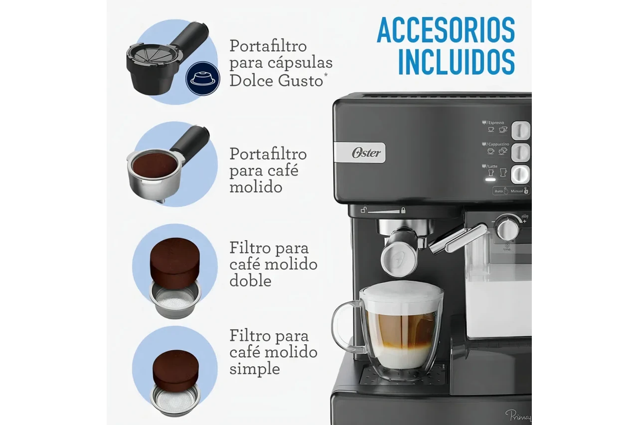 Cafetera Espresso Oster® PrimaLatte™ EM6603 Vive la experiencia de un café auténtico y delicioso que ofrece la cafetera automática de espresso Oster® PrimaLatte™. Ahora con funciones que te permiten disfrutar variedades de bebidas, desde espresso, capuccinos y lattes, hasta el uso de cápsulas de Dolce Gusto*. Todo al toque de un botón. Prepara tus bebidas favoritas utilizando tu marca predilecta de café molido, mientras automáticamente espumas la leche fresca de tu elección. Todo servido en la misma taza, al momento que desees. También te ofrece un nuevo diseño, ¡Ideal para tu cocina! Características: - Prepara cappuccinos, lattes y espressos al toque de un botón. - Bomba italiana de 15 bar, para una mejor extracción de café y crema. - Depósito de leche desmontable y fácil de almacenar. - Bandeja ajustable a diferentes tamaños de tazas. - Cuenta con porta filtro para café molido, 2 filtros para café molido sencillo y doble, porta filtro para cápsulas Dolce Gusto*, cuchara medidora con apisonador de café y manual de usuario con recetario de bebidas incluido. - Compatible con cápsulas de Doce Gusto*. - Medidas: 31.2 x 22.5 x 28 cm. - Peso: 4,1 kg. - Potencia: 1050 Watts. - Origen China.