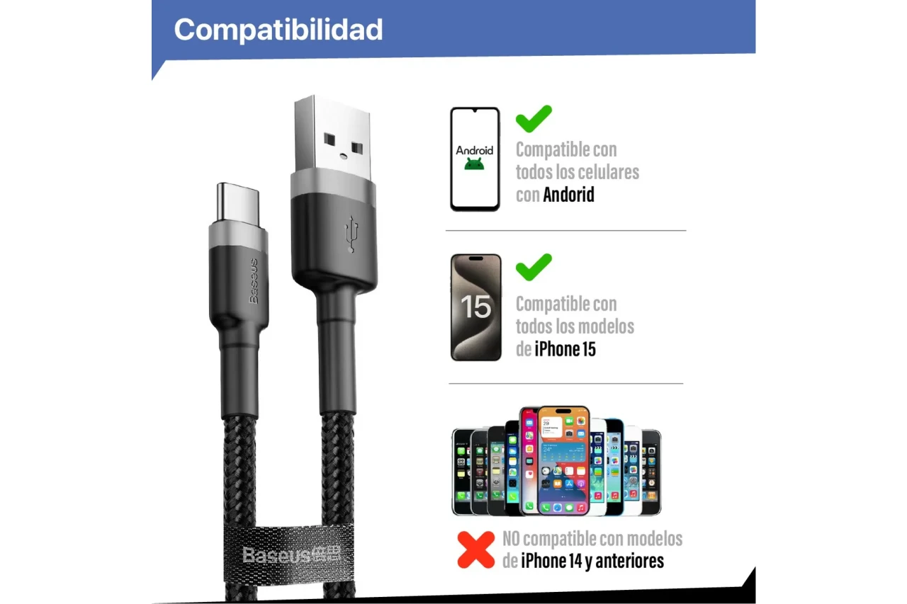 El cable USB-A a USB-C es la solución perfecta para tus necesidades de carga y transferencia de datos, y lo mejor de todo, ¡es compatible Iphone 15/16/17! CARACTERISTICAS DESTACADAS Compatibilidad con iPhone 15 / 16 / 17 : Este cable ha sido diseñado específicamente para funcionar sin problemas con los últimos Iphone. Olvídate de la frustración de buscar cables compatibles, este es el indicado. Velocidad de transmisión rápida: Con una velocidad de transmisión de datos de 480Mbps, podrás transferir archivos de manera rápida y eficiente, lo que significa menos tiempo esperando y más tiempo disfrutando de tus dispositivos. Construcción resistente: Este cable está hecho para durar. Su material de alta calidad incluye ABS, un plástico de alta resistencia, y un mallado de nylon que lo hace resistente a la abrasión y evita enredos. No tendrás que preocuparte por su durabilidad. ESPECIFICACIONES: - Compatible con iPhone 15 / 16 / 17 - Plug 1: USB-A - Plug 2: USB-C - Longitud: 1 Metro - Velocidad de transmisión: 480Mbps - Output corriente: 5V-3A / 9V-2A - Material: Aluminio, ABC (plástico de lata resistencia) y mallado de nylon
