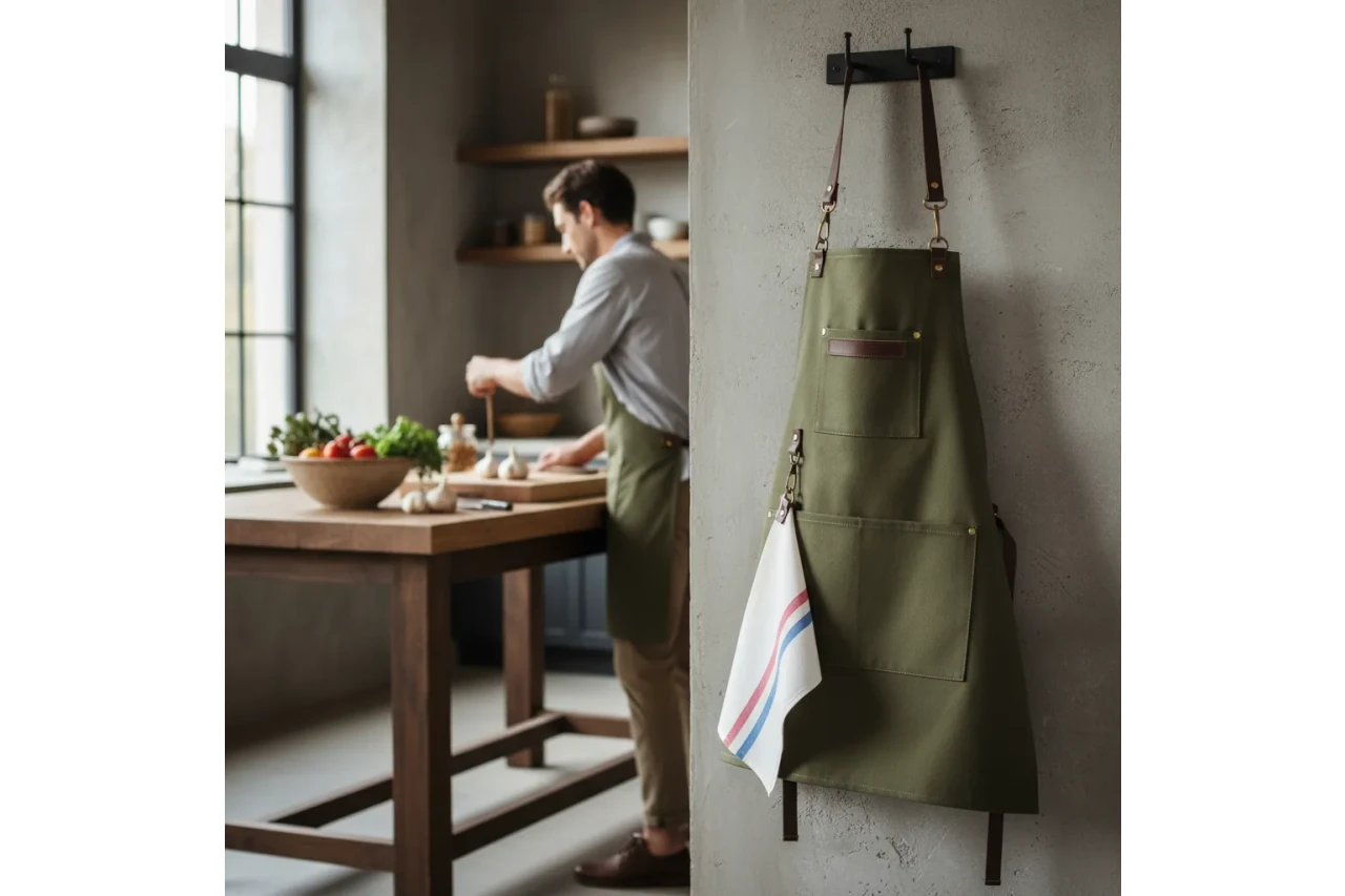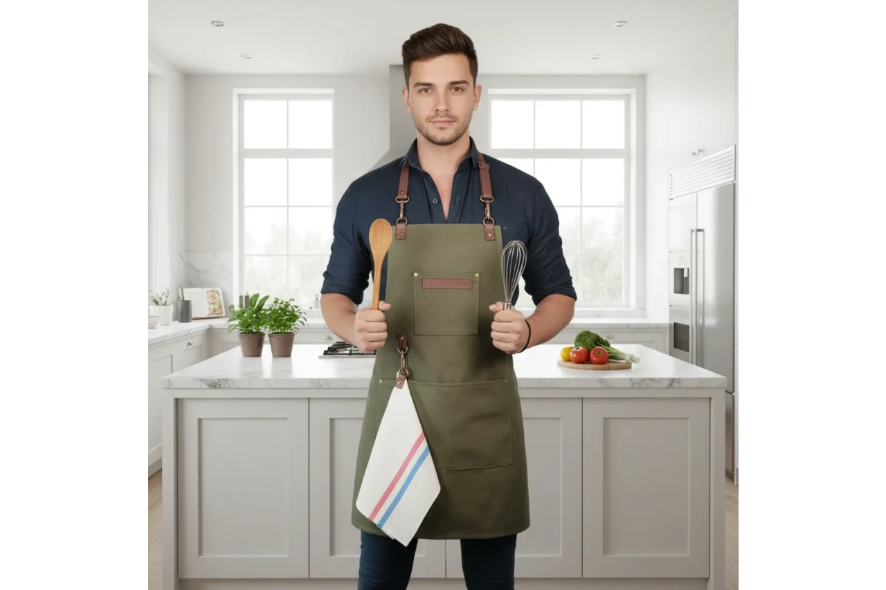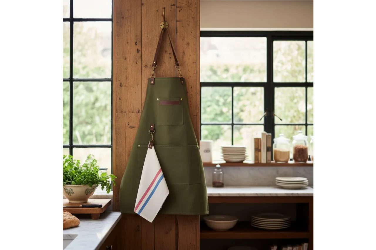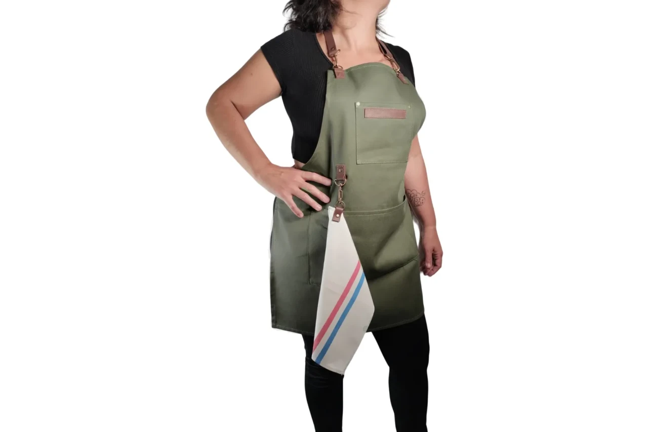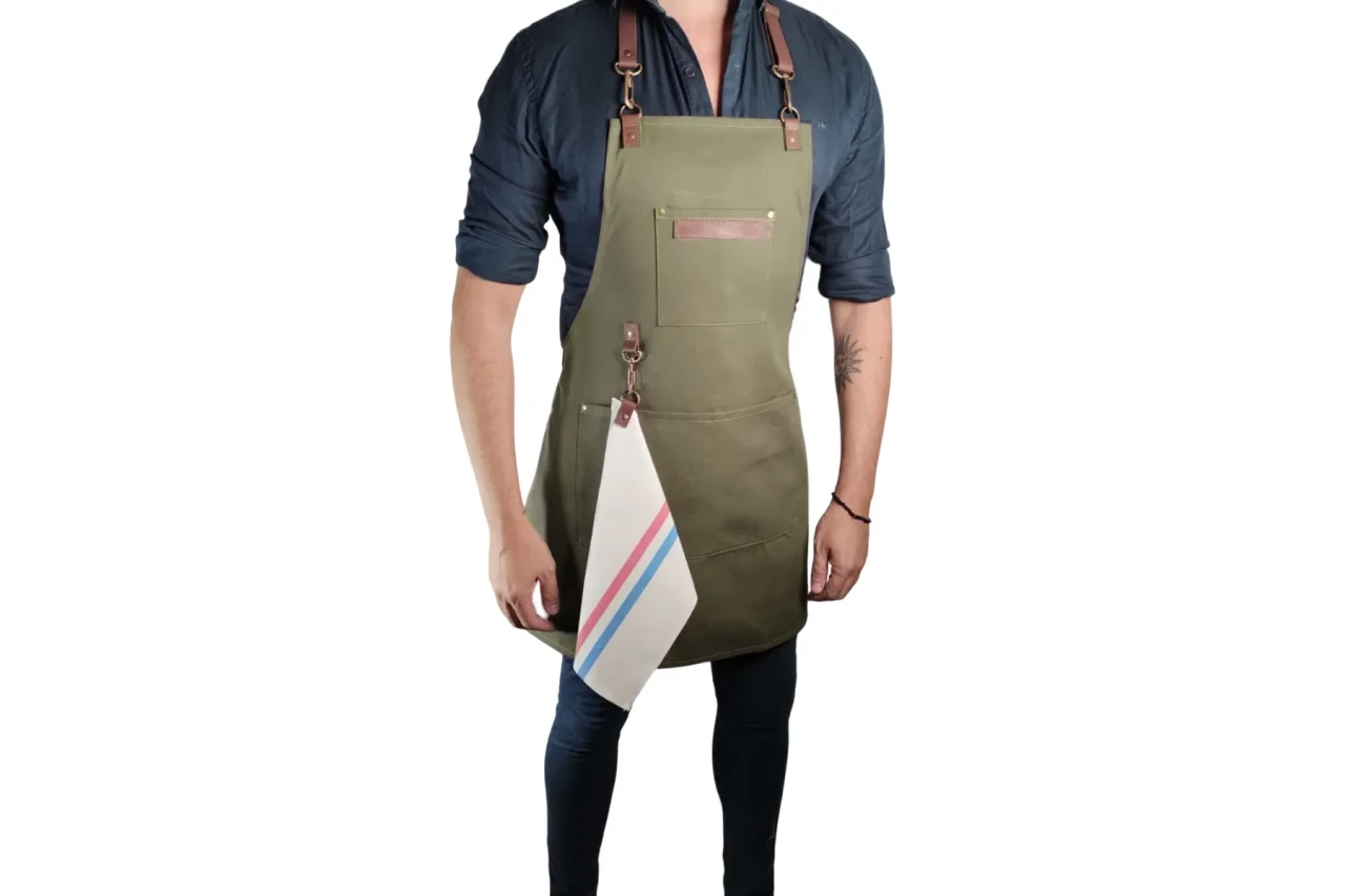 + Delantal de gabardina y cuero vacuno genuino.