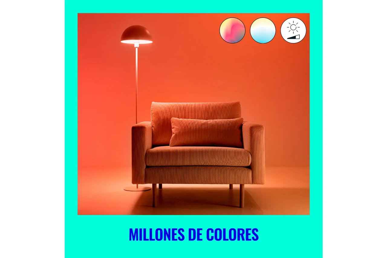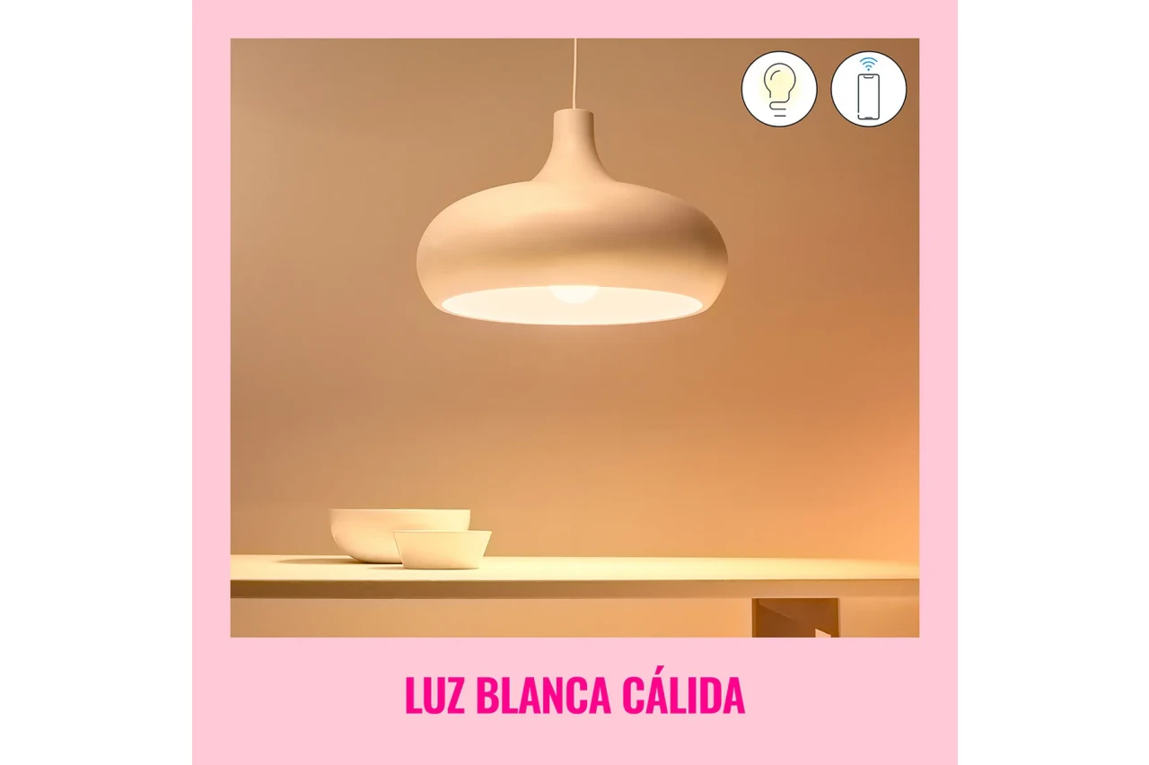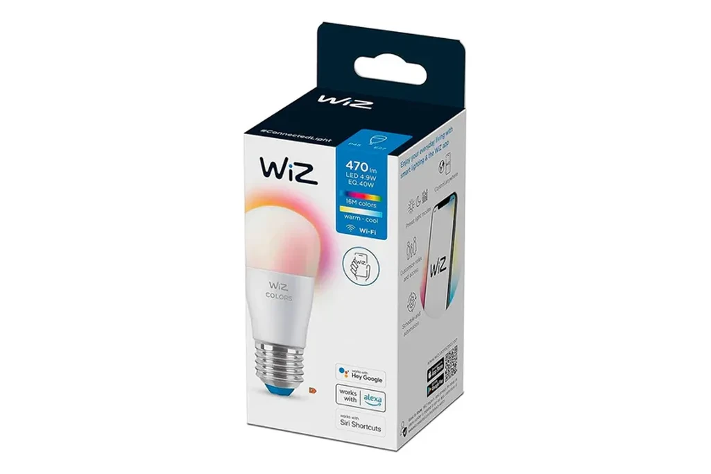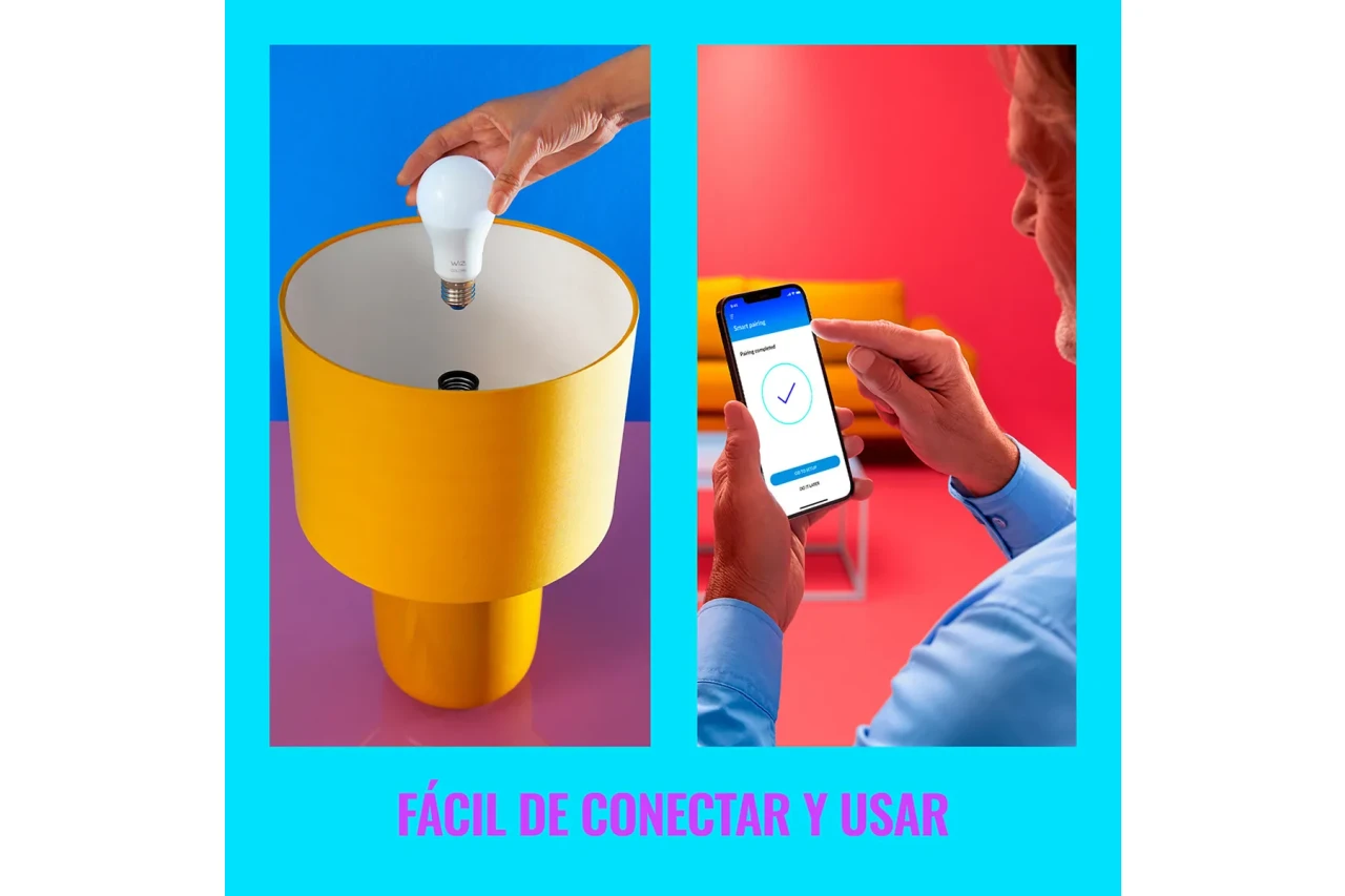 Ampolleta inteligente WiFi Wiz Full Color P45 E27 * Luz inteligente de colores * Hasta 470 lúmenes * Conéctala y listo * Control mediante aplicación o voz Funciones de iluminación inteligente fáciles de configurar Conecta la luz WiZ a la red Wi-Fi y disfruta de las funciones inteligentes al instante. Programa las luces para que se enciendan y apaguen de manera automática cuando estés fuera de casa. No es necesario instalar ningún hardware adicional. Controla el consumo de electricidad Con la aplicación WiZ, obtén una descripción general del consumo eléctrico de las luces. Accede a un informe semanal o diario para ayudarte a mantenerte al tanto del consumo de energía. Configura las luces para seguir tu propio horario Automatiza las luces inteligentes para seguir las rutinas diarias o semanales. Programa las luces para que se enciendan en la mañana o antes de llegar a casa, y mantenlas apagadas para ahorrar energía, cuando no sean necesarias. Crea tu escena de luz perfecta Mezcla modos de luz blanca y de distintos colores para crear la atmósfera luminosa perfecta para tus momentos diarios. Guarda tu nueva escena y selecciónala en cualquier momento con la aplicación WiZ o tu voz. Millones de colores y modos de luz cambiantes para alegrar tu día Elige el color de luz que desees o aplica un modo de luz dinámico. Chimenea u Océano, por ejemplo, te ayudarán a crear una atmósfera increíble. Configura el ambiente indicado con la luz blanca personalizable de cálida a fría Elige entre una amplia gama de luces que van de blancas frías y revitalizantes a blancas cálidas y suaves, o selecciona uno de los modos predefinidos, como Concentración o Relajación. Controla las luces inteligentes desde cualquier lugar No hay necesidad de preocuparse si las luces se quedaron encendidas. Simplemente apágalas desde donde estés, con tu teléfono inteligente.