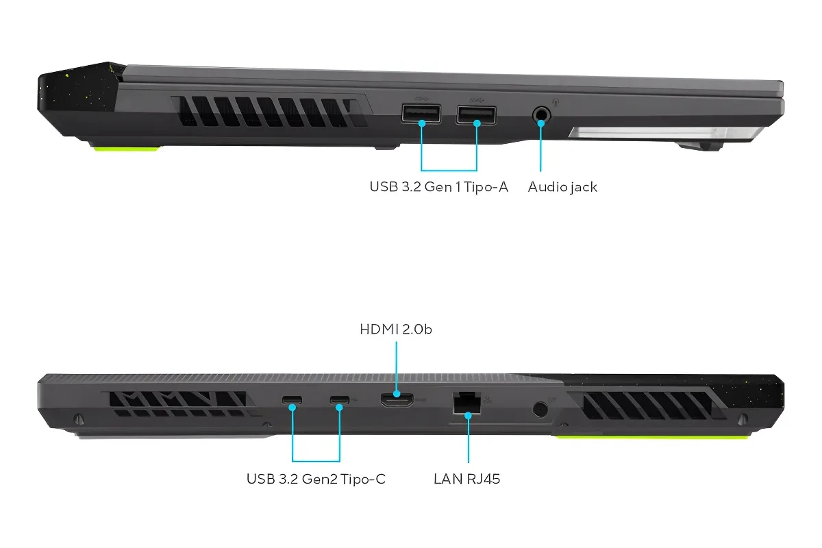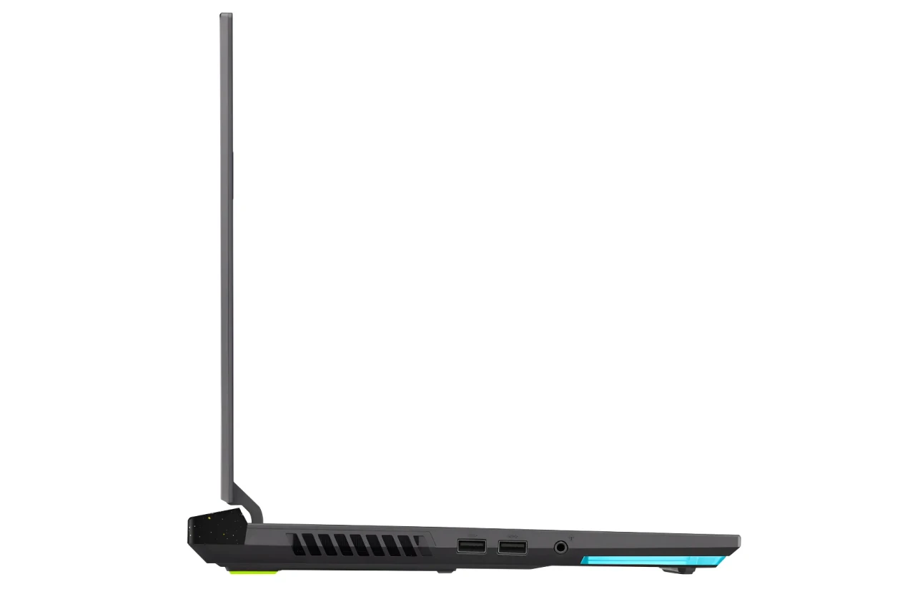Los puertos del ROG Strix G incluyen 2 USB Tipo-A y un jack de audífonos en el lado izquierdo y 1 USB Tipo-A adicional, 1 HDMI, 1 USB-C y un puerto RJ45 en la parte trasera.