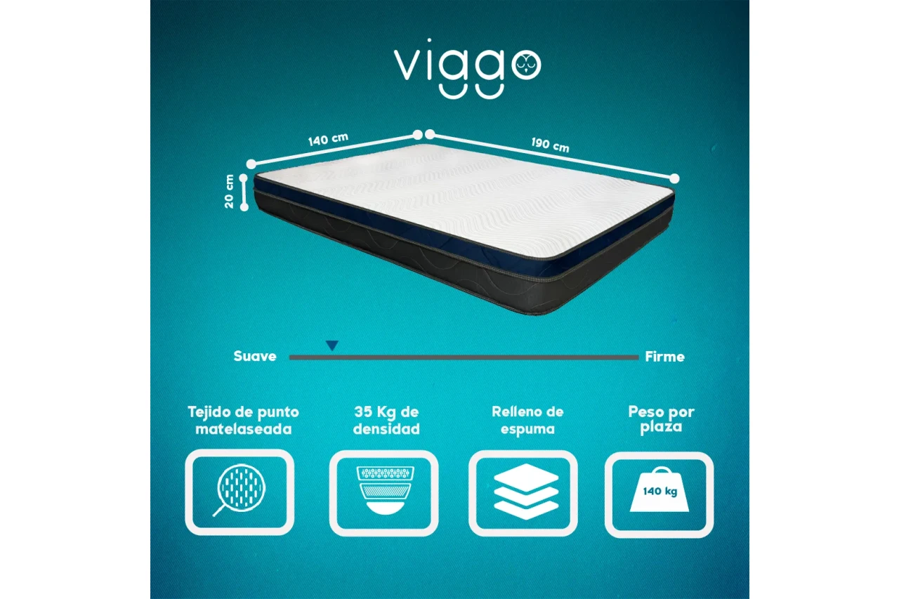 Comercio: Picca Hogar Producto: Colchón en caja Viggo D35 Eurotop 140x190 cm Características: -Espuma de alta densidad de soporte 35kg/m3. -Espumas soft para mayor adaptabilidad. -Ideal para quienes prefieren descansar en un perfecto balance entre soporte y comodidad. -Sensación de apoyo suave, su alta densidad no implica que sea un colchón firme. -Funda confeccionada en algodón con terminaciones en tejido de punto, el cual permite que conserves la temperatura ideal durante tu descanso. - Peso máximo soportado: 140kg por persona o por plaza. Dimensiones: Ancho: 140 cm Largo: 190 cm Alto: 20 cm