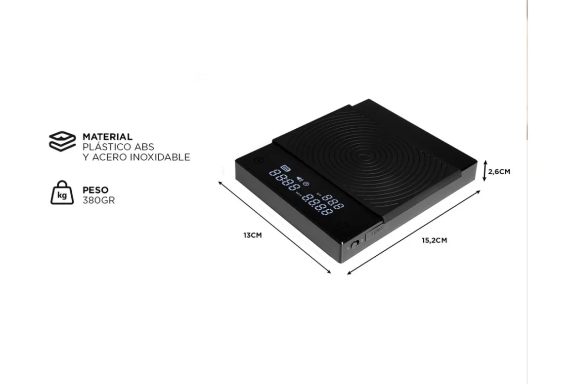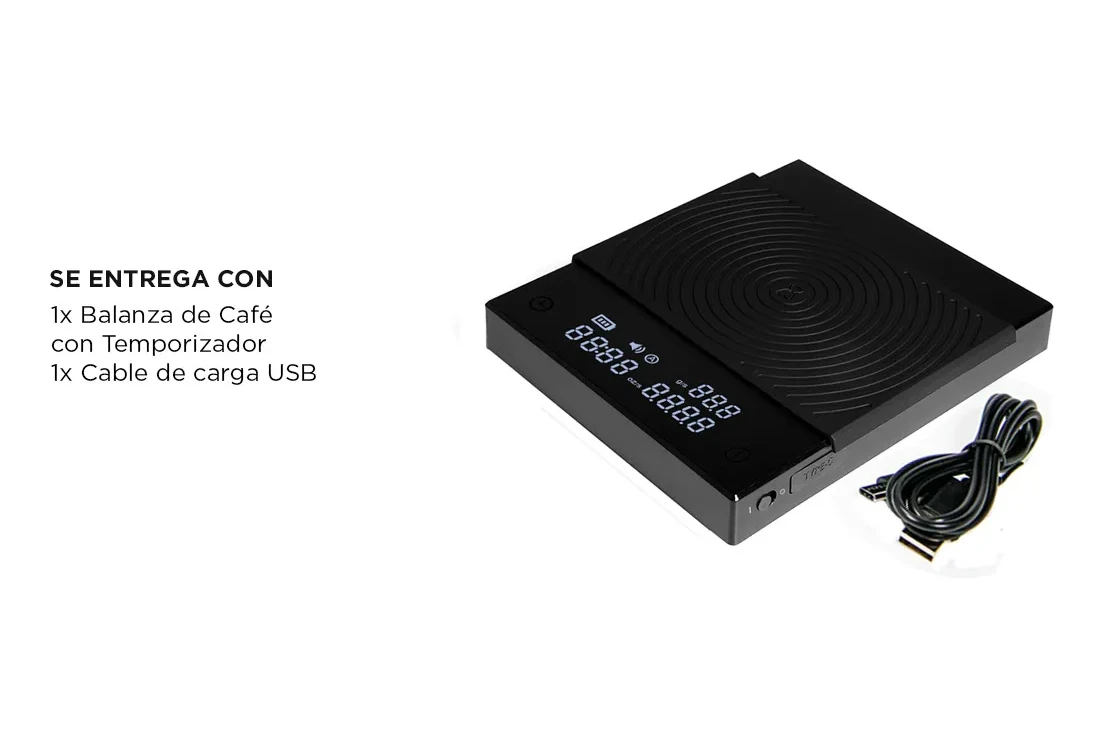 Balanza de Café Plus Timemore con temporizador Timemore presenta la nueva Balanza de Café Plus con Temporizador: Precisión en el Pesaje: Equipado con una plataforma de pesaje de alta precisión, garantiza mediciones exactas de café y agua, permitiéndote reproducir tus recetas favoritas con consistencia. Temporizador Incorporado: La función de temporización te permite controlar el tiempo de extracción, un aspecto crucial para obtener el sabor y aroma deseados en tu café. Diseño Elegante y Funcional: Con un diseño minimalista en color negro, este dispositivo no solo se integra armoniosamente en cualquier entorno de preparación de café, sino que también es fácil de usar gracias a su interfaz intuitiva. Pantalla LED Retroiluminada: La pantalla LED retroiluminada facilita la lectura de las mediciones, incluso en condiciones de poca luz, brindándote un control total durante todo el proceso de preparación. Portátil y Duradera: Compacta y liviana, la balanza Timemore Coffee Basic Plus es fácil de transportar y está construida con materiales duraderos, asegurando una larga vida útil. Función de Apagado Automático: Para conservar la energía de la batería, cuenta con una función de apagado automático después de un período de inactividad. CARACTERÍSTICAS: - Material: Plástico ABS y acero inoxidable - Color: Negro - Capacidad de Peso: Hasta 2 kg - Precisión de Pesaje: 0.1 g - Temporizador: Sí, con pantalla LED - Batería de litio recargable: 1600 mAh incorporada SE ENTREGA CON: - 1x Balanza de Café con Temporizador - 1x Cable de carga USB