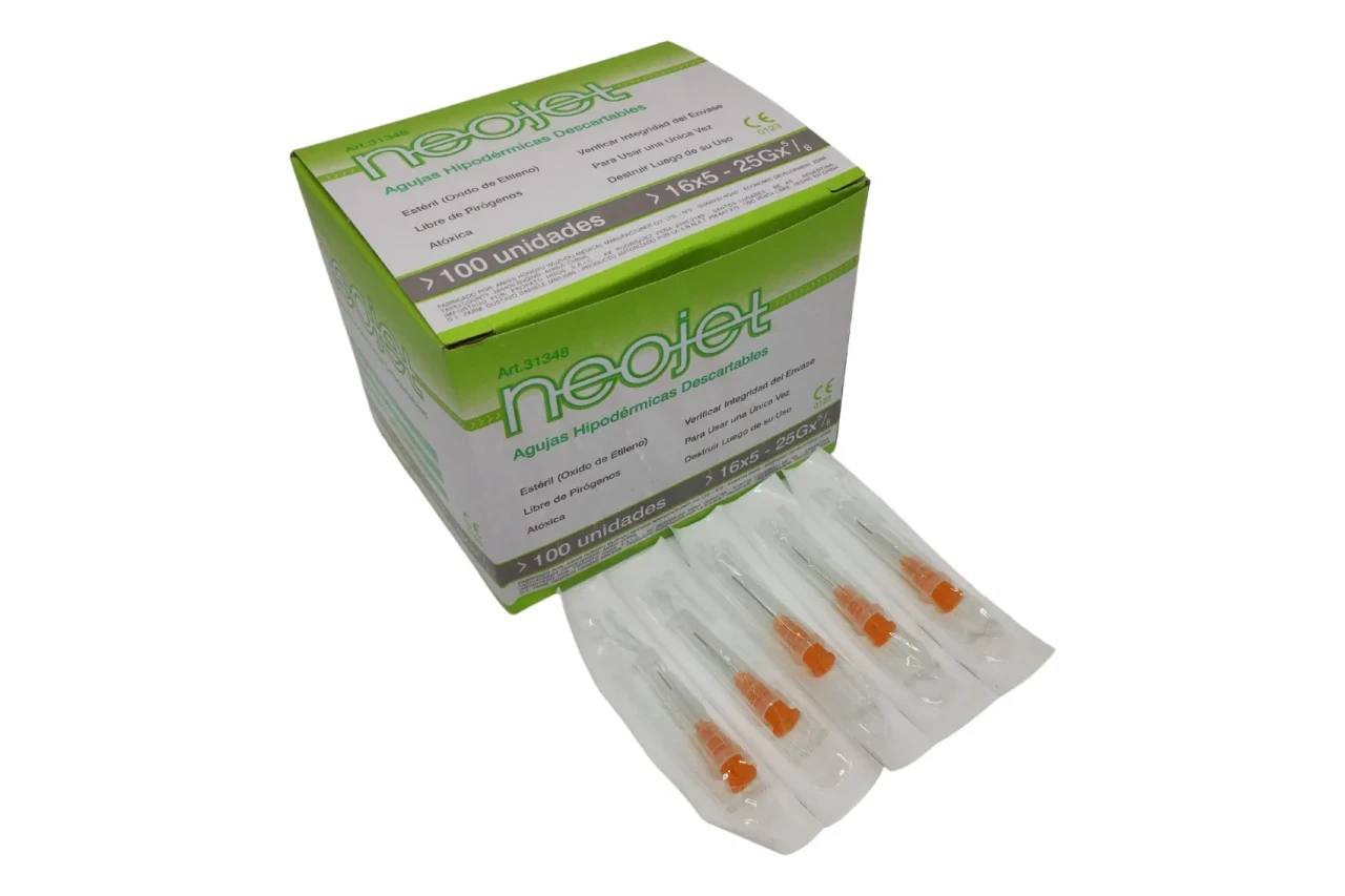 La Aguja Hipodérmica Descartable 16x5 25g X 5/8 es un producto esencial para aplicaciones médicas y particulares, diseñada para garantizar la máxima precisión y comodidad en su uso. Cada caja contiene 100 unidades, lo que la convierte en una opción práctica y económica para profesionales de la salud. Fabricada por la reconocida marca Neojet, esta aguja cuenta con un número de habilitación de ANMAT: 647-275, asegurando su calidad y cumplimiento con las normativas vigentes. Su modelo 16x5 25G presenta una punta tipo catéter, ideal para procedimientos que requieren un acceso rápido y eficiente. Además, es completamente descartable, lo que garantiza la seguridad y la higiene en cada uso. Con un IVA del 21% y un impuesto interno del 0%, esta aguja es una opción accesible para todos. Su condición es nueva y está lista para ser utilizada en cualquier entorno médico o particular.