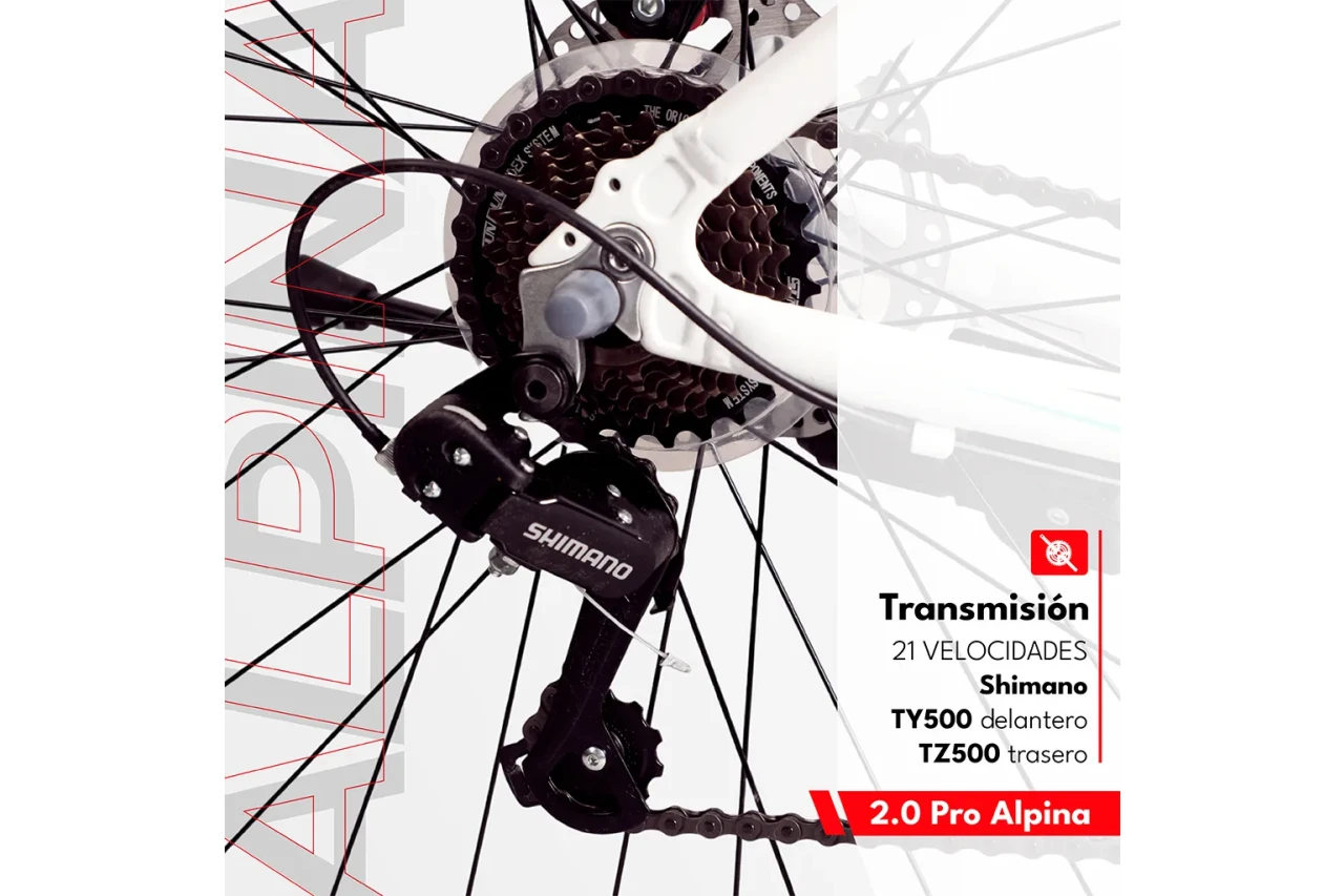 CUADRO: CUADRO ACERO MTB ALPINA 2.0 PRO TRANSMISION 21V: CAMBIO DELANTERO: SHIMANO TY500 CAMBIO TRASERO/DESCARRILADOR: SHIMANO TZ500 MANIJAS INTEGRADAS SUN RUN KD-80 PUNTO A PUNTO 3x7 PALANCAS TRIPLE ACERO PIÑON 7 VELOCIDADES A ROSCA HORQUILLA: HORQUILLA SUSPENSION ALPINA FRENOS: FRENOS A DISCO MECÁNICO RUEDAS: RUEDAS MTB CUBIERTA 29X2.10 LLANTAS DOBLE PARED LAS CUBIERTAS SON IMPORTADAS, DE LAS MARCAS EAKIA O WANDA, DOS DE LAS MEJORES MARCAS IMPORTADAS. SE PUEDE ENTREGAR CUALQUIERA DE LAS DOS SEGÚN DISPONIBILIDAD DE STOCK AL MOMENTO DE HACER LA COMPRA. COMPONENTES: PIE ALUMINIO REGULABLE STEM ALUMINIO PEDAL PVC IMPORTANTE: - LAS BICICLETAS SE ENTREGAN TESTEADAS, NUEVAS DIRECTAMENTE DE FABRICA, EN SU CAJA ORIGINAL CERRADA Y CON SU CORRESPONDIENTE GARANTÍA. - EL USUARIO DEBE REALIZAR EL ENSABLADO Y LA PUESTA A PUNTO DE LOS QUIPOS. HAY QUE COLOCAR PEDALES, MANUBRIO, ASIENTO, CENTRAR RUEDAS, ENGRASAR Y AJUSTAR CAJA PEDALERA Y REALIZAR CALIBRADO DE CAMBIOS Y FRENOS. - ES RECOMENDABLE QUE EL ARMADO LO HAGA PERSONAL IDEONEO PARA EVITAR ROTURA DE EQUIPOS. CONDICIONES PARA RETIRAR BICICLETAS ARMADAS POR EL LOCAL: - EL ARMADO ES GRATUITO PARA QUIENES RETIREN POR EL LOCAL Y LO HAGAN EN EL DIA ESTABLECIDO. - EN CASO DE QUE SE RETIRE PASADAS LAS 48 HS HABILES DEL AGENDADO DEL ARMADO TENDRA UN COSTO ADICIONAL DE VEINTICINCO MIL PESOS ( $25.000 ), SIN EXCEPCION. - EL ARMADO DEBE COORDINARSE CON UN MINIMO DE 48 HORAS HABILES DE ANTICIPACIÓN. - POR CUESTIONES DE ESPACIO Y TIEMPO LOS CUPOS SON LIMITADOS ACLARACIÓN: LAS FOTOS SON ILUSTRATIVAS, ALGUNOS DETALLES ESTAN SUJETOS A CAMBIOS DE FABRICA