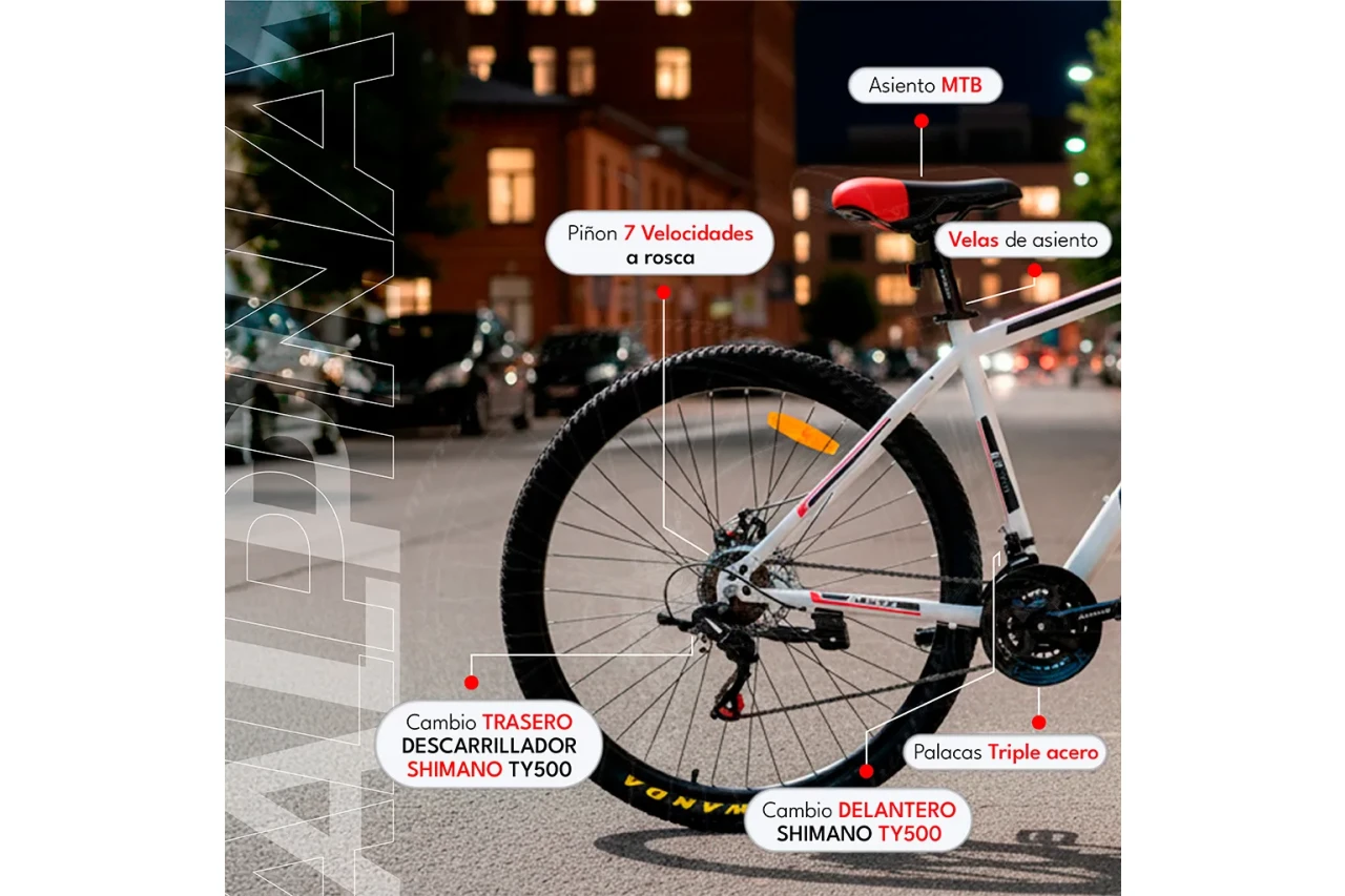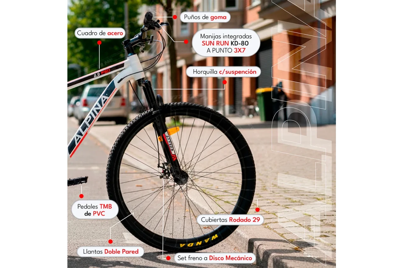 CUADRO: CUADRO ACERO MTB ALPINA 2.0 PRO TRANSMISION 21V: CAMBIO DELANTERO: SHIMANO TY500 CAMBIO TRASERO/DESCARRILADOR: SHIMANO TZ500 MANIJAS INTEGRADAS SUN RUN KD-80 PUNTO A PUNTO 3x7 PALANCAS TRIPLE ACERO PIÑON 7 VELOCIDADES A ROSCA HORQUILLA: HORQUILLA SUSPENSION ALPINA FRENOS: FRENOS A DISCO MECÁNICO RUEDAS: RUEDAS MTB CUBIERTA 29X2.10 LLANTAS DOBLE PARED LAS CUBIERTAS SON IMPORTADAS, DE LAS MARCAS EAKIA O WANDA, DOS DE LAS MEJORES MARCAS IMPORTADAS. SE PUEDE ENTREGAR CUALQUIERA DE LAS DOS SEGÚN DISPONIBILIDAD DE STOCK AL MOMENTO DE HACER LA COMPRA. COMPONENTES: PIE ALUMINIO REGULABLE STEM ALUMINIO PEDAL PVC IMPORTANTE: - LAS BICICLETAS SE ENTREGAN TESTEADAS, NUEVAS DIRECTAMENTE DE FABRICA, EN SU CAJA ORIGINAL CERRADA Y CON SU CORRESPONDIENTE GARANTÍA. - EL USUARIO DEBE REALIZAR EL ENSABLADO Y LA PUESTA A PUNTO DE LOS QUIPOS. HAY QUE COLOCAR PEDALES, MANUBRIO, ASIENTO, CENTRAR RUEDAS, ENGRASAR Y AJUSTAR CAJA PEDALERA Y REALIZAR CALIBRADO DE CAMBIOS Y FRENOS. - ES RECOMENDABLE QUE EL ARMADO LO HAGA PERSONAL IDEONEO PARA EVITAR ROTURA DE EQUIPOS. CONDICIONES PARA RETIRAR BICICLETAS ARMADAS POR EL LOCAL: - EL ARMADO ES GRATUITO PARA QUIENES RETIREN POR EL LOCAL Y LO HAGAN EN EL DIA ESTABLECIDO. - EN CASO DE QUE SE RETIRE PASADAS LAS 48 HS HABILES DEL AGENDADO DEL ARMADO TENDRA UN COSTO ADICIONAL DE VEINTICINCO MIL PESOS ( $25.000 ), SIN EXCEPCION. - EL ARMADO DEBE COORDINARSE CON UN MINIMO DE 48 HORAS HABILES DE ANTICIPACIÓN. - POR CUESTIONES DE ESPACIO Y TIEMPO LOS CUPOS SON LIMITADOS ACLARACIÓN: LAS FOTOS SON ILUSTRATIVAS, ALGUNOS DETALLES ESTAN SUJETOS A CAMBIOS DE FABRICA