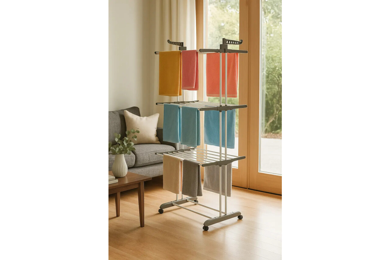 El Tender Vertical 3 Niveles de Home World es la solución ideal para quienes buscan optimizar el espacio en el hogar mientras mantienen la ropa fresca y bien secada. Diseñado para ofrecer una capacidad de carga de hasta 50 kg, este tendedero de pie es perfecto para familias o para quienes tienen grandes cantidades de ropa que tender. Con un tamaño desplegado de 63 cm de largo y 1.2 m de ancho, el tendedero proporciona un amplio espacio para colgar diversas prendas. Su altura de 1.74 m permite un uso confortable, mientras que su diseño vertical lo hace perfecto para espacios reducidos, maximizando la eficiencia en cada rincón de su hogar. La facilidad de uso se presenta a través de sus alas extensibles, que permiten una mayor versatilidad al colgar prendas voluminosas. Además, su estructura es portátil y ligera, facilitando su traslado gracias a las ruedas incluidas, lo que brinda la conveniencia de moverlo a sus áreas preferidas sin esfuerzo. Fabricado en plástico resistente y con un elegante diseño en color gris y blanco, este tendedero no solo es funcional sino también estéticamente agradable, complementando la decoración de su hogar. Experimentar la comodidad y eficiencia en el secado de su ropa es más sencillo con este práctico accesorio, que se pliega fácilmente para un almacenaje sin complicaciones.