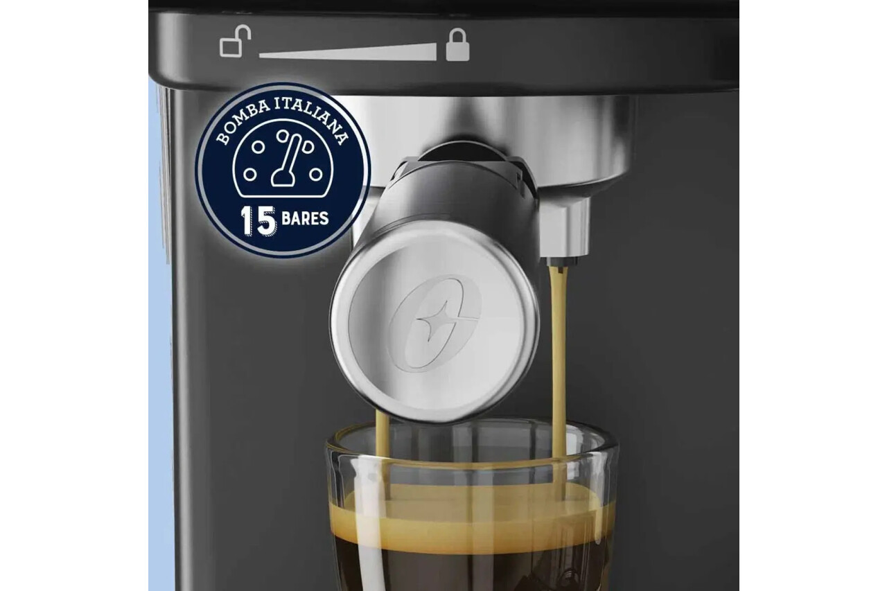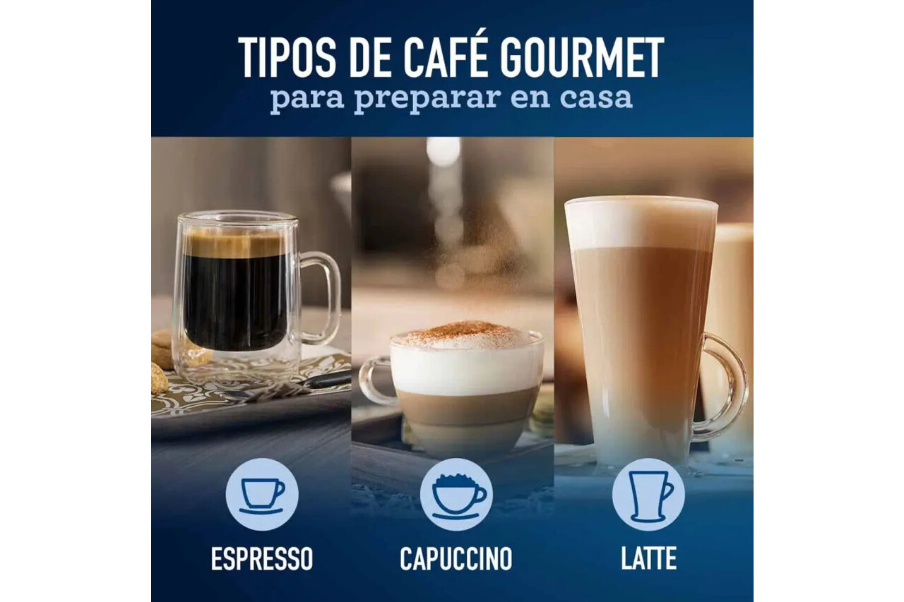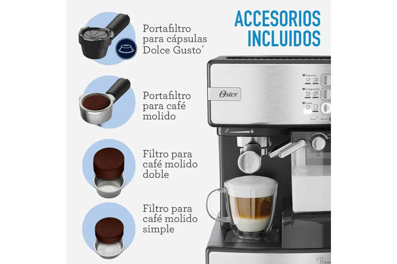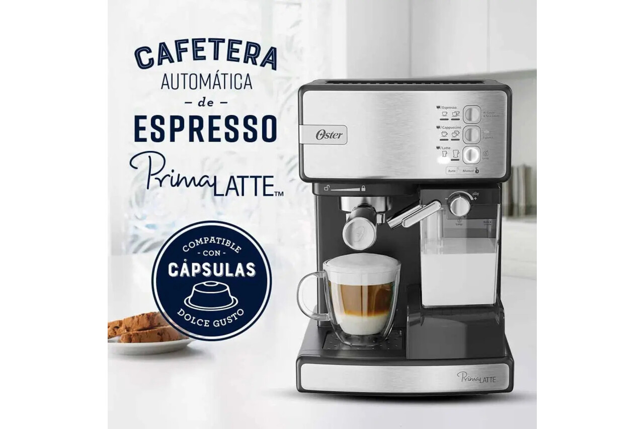Cafetera Espresso Oster® PrimaLatte™ EM6603 Vive la experiencia de un café auténtico y delicioso que ofrece la cafetera automática de espresso Oster® PrimaLatte™. Ahora con funciones que te permiten disfrutar variedades de bebidas, desde espresso, capuccinos y lattes, hasta el uso de cápsulas de Dolce Gusto*. Todo al toque de un botón. Prepara tus bebidas favoritas utilizando tu marca predilecta de café molido, mientras automáticamente espumas la leche fresca de tu elección. Todo servido en la misma taza, al momento que desees. También te ofrece un nuevo diseño, ¡Ideal para tu cocina! Características: - Prepara cappuccinos, lattes y espressos al toque de un botón. - Bomba italiana de 15 bar, para una mejor extracción de café y crema. - Depósito de leche desmontable y fácil de almacenar. - Bandeja ajustable a diferentes tamaños de tazas. - Cuenta con porta filtro para café molido, 2 filtros para café molido sencillo y doble, porta filtro para cápsulas Dolce Gusto*, cuchara medidora con apisonador de café y manual de usuario con recetario de bebidas incluido. - Compatible con cápsulas de Doce Gusto*. - Medidas: 31.2 x 22.5 x 28 cm. - Peso: 4,1 kg. - Potencia: 1050 Watts. - Origen China.