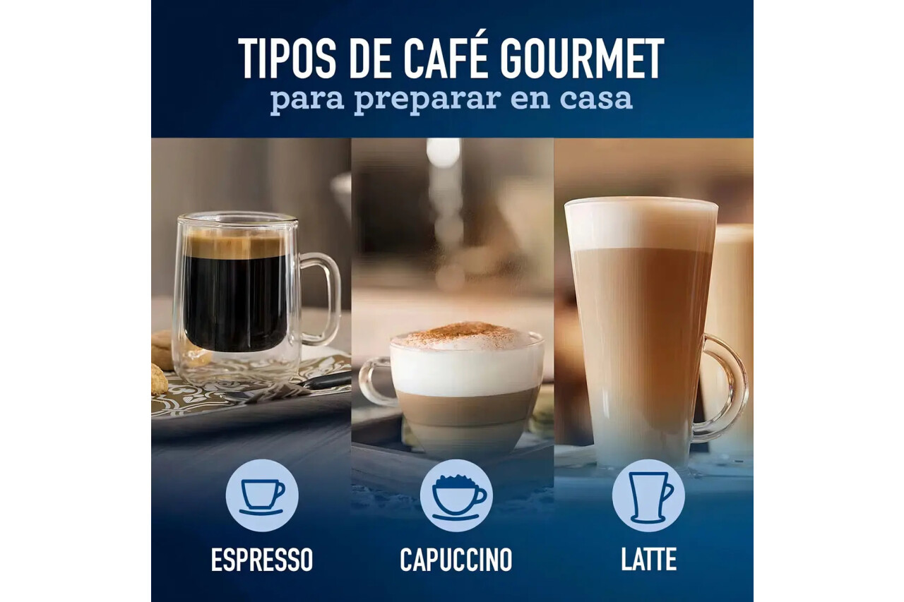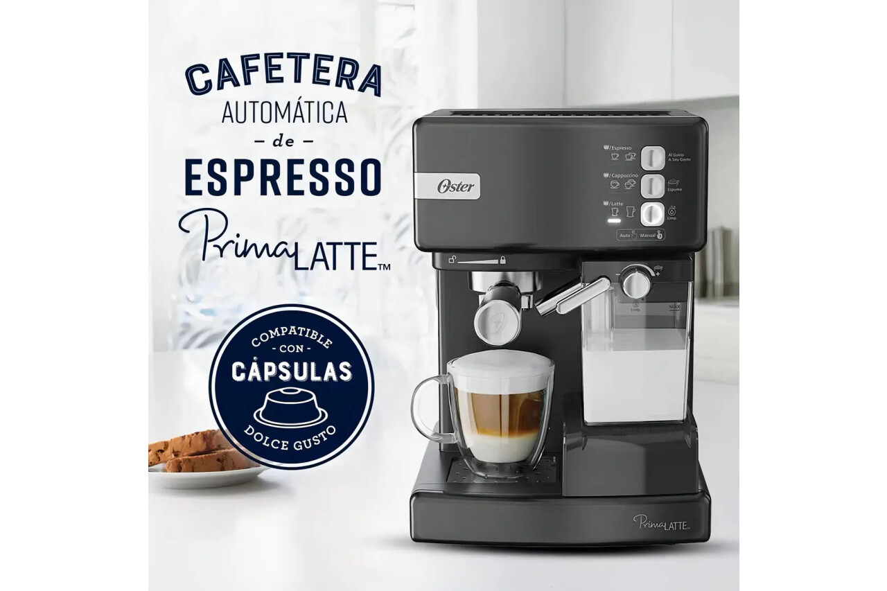 Cafetera Espresso Oster® PrimaLatte™ EM6603 Vive la experiencia de un café auténtico y delicioso que ofrece la cafetera automática de espresso Oster® PrimaLatte™. Ahora con funciones que te permiten disfrutar variedades de bebidas, desde espresso, capuccinos y lattes, hasta el uso de cápsulas de Dolce Gusto*. Todo al toque de un botón. Prepara tus bebidas favoritas utilizando tu marca predilecta de café molido, mientras automáticamente espumas la leche fresca de tu elección. Todo servido en la misma taza, al momento que desees. También te ofrece un nuevo diseño, ¡Ideal para tu cocina! Características: - Prepara cappuccinos, lattes y espressos al toque de un botón. - Bomba italiana de 15 bar, para una mejor extracción de café y crema. - Depósito de leche desmontable y fácil de almacenar. - Bandeja ajustable a diferentes tamaños de tazas. - Cuenta con porta filtro para café molido, 2 filtros para café molido sencillo y doble, porta filtro para cápsulas Dolce Gusto*, cuchara medidora con apisonador de café y manual de usuario con recetario de bebidas incluido. - Compatible con cápsulas de Doce Gusto*. - Medidas: 31.2 x 22.5 x 28 cm. - Peso: 4,1 kg. - Potencia: 1050 Watts. - Origen China.