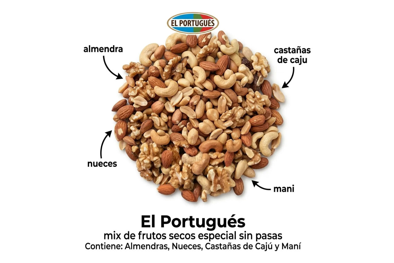MIX DE FRUTOS SECOS ESPECIAL SIN PASAS X 1KG - ESPECIFICACIONES DEL PRODUCTO: Marca: El Portugués. Peso Neto: 1 Kilogramo. Origen: Argentina. Presentación: Envase sellado para garantizar frescura y calidad. ¿QUÉ INCLUYE NUESTRO MIX ESPECIAL? Esta exquisita combinación contiene: Castañas de Cajú: Cremosas y llenas de sabor. Nueces: El aliado perfecto para tu cerebro. Almendras: Crocantes y cargadas de Vitamina E. Maní Seleccionado: Energía pura y proteínas. BENEFICIOS PARA TU SALUD Y BIENESTAR: Incorporar este mix a tu dieta diaria te aporta: Energía Natural: Ideal para deportistas, estudiantes y días largos. Potencia Intelectual: Rico en Omega-3, Vitamina B, Lecitina y Fósforo, nutrientes esenciales para la concentración y la memoria. Cuidado Cardíaco: Sus propiedades cardioprotectoras ayudan a reducir el colesterol y los triglicéridos. Nutrición Completa: Gran fuente de proteínas, fibra, calcio y ácidos grasos esenciales. ¿CÓMO DISFRUTARLO? (USOS): Este mix es súper versátil. Aquí te damos algunas ideas: Snack Saludable: Directo de la bolsa, perfecto para cualquier momento del día. Desayunos y Meriendas: Increíble con yogur, granola, avena o leche vegetal. Topping para Ensaladas: Aporta un toque crocante y nutritivo a tus comidas. Repostería y Postres: Ideal para incorporar en tortas, budines o helados. Picadas: Una opción elegante y saludable para compartir con amigos o familia. ¡No esperes más! Sumá calidad y nutrición a tu vida con este Mix Especial de El Portugués. ¡Hacé tu pedido ahora! Garantía del vendedor: 1 meses