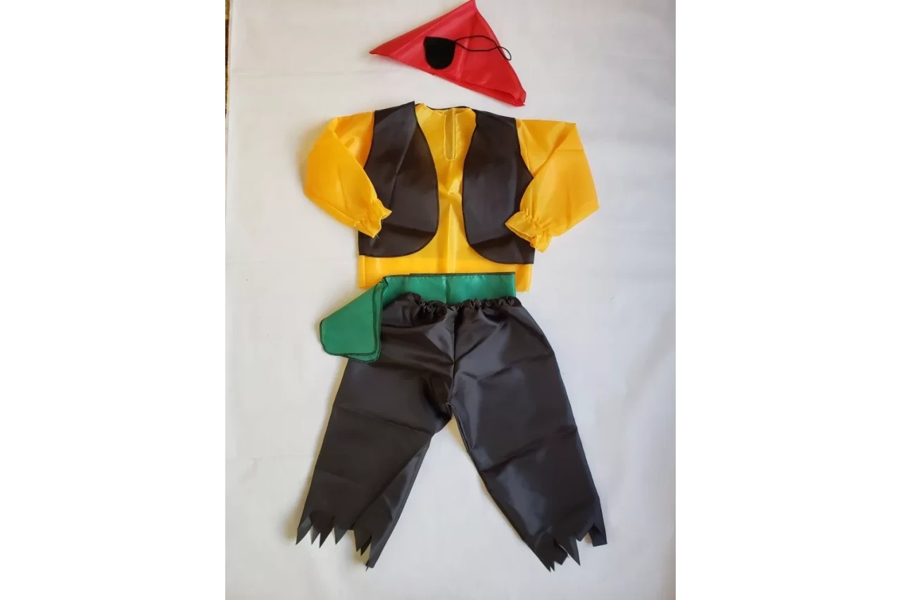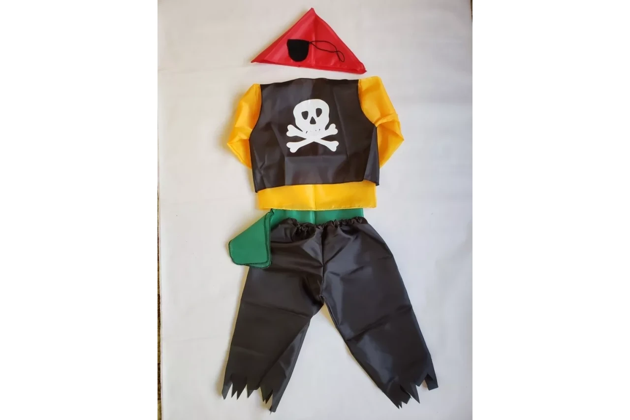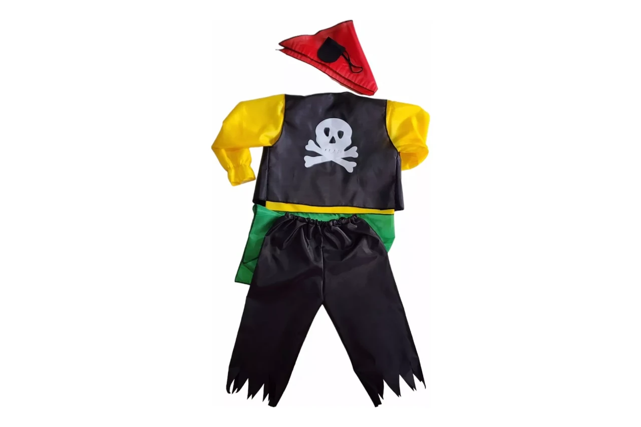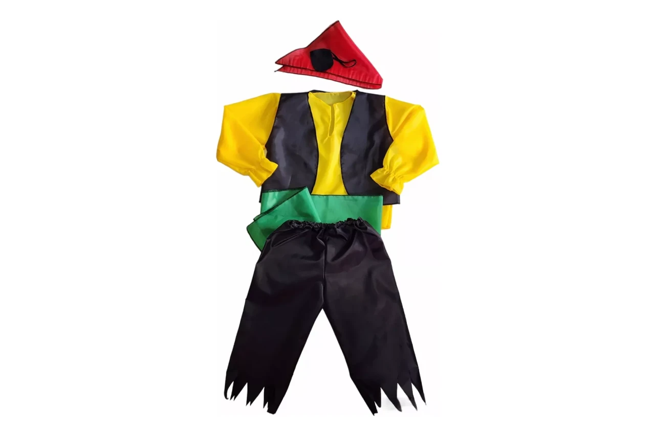 Disfraz de Pirata para niños en tela de muy buena calidad con excelentes costuras. Consta de 6 piezas -Camisa con puños elásticos y cuello en V de tafeta con impecables terminaciones color amarillo. -Chaleco negro abierto de tafeta con calavera de PVC en espalda. -Pantalón negro de tafeta con bajos "desgarrados" y cintura con elástico -Bandana de tafeta + parche de tela suave con elástico de excelente calidad. -Faja para la cintura de tafeta. Disponible en 3 talles - Talle 0 recomendado para Talles de ropa 2/4/6 - Talle 1 recomendado para talle de ropa 8/10 - Talle 2 recomendado para 6/8 años talle de ropa 12/14 MEDIDAS TALLE 0 -LARGO CAMISA 36.CM -SISA 30.CM -MANGA .32.CM -LARGO CHALECO 32.CM -LARGO PANTALÓN 47.CM -ELÁSTICO CEDE HASTA 60.CM TALLE 1 -LARGO CAMISA 40CM -SISA 38CM -MANGA 39CM -LARGO CHALECO 33CM -LARGO PANTALÓN 57CM -ELÁSTICO CEDE HASTA 70CM TALLE 2 -LARGO CAMISA 50.CM -SISA 43.CM -MANGA 45.CM -LARGO CHALECO 40.CM -LARGO PANTALÓN 62.CM -ELÁSTICO CEDE HASTA 84.CM Cualquier duda preguntanos! Tu consulta no molesta! -