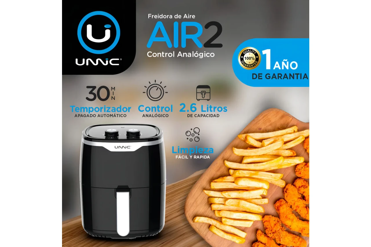 Freidora De Aire Digital Eléctrica Unnic Air02 Sin Aceite Freidora De Aire Unnic Air02, con un diseño resistente; que la hacen la mejor opción por su Potencia y Portabilidad, la mejor opción que la posiciona delante de los más modernos y competitivos productos de esta gama. Bandeja de 2,6 Litros Y Potencia de 1400W Con la nueva freidora eléctrica sin aceite podrá freír, tostar, asar e incluso hornear. Con su innovadora tecnología Rapid Air no solo es fantástica para freír, sino que también le permite tostar, hornear e incluso asar sus platos favoritos: una solución completa para todas sus comidas. Temporizador y regulador de temperatura de ajuste manual: su temporizador integrado le permite preajustar tiempos de cocción de hasta 30 minutos. La función de apagado automático. El control de temperatura completamente ajustable le permite pre ajustar la mejor temperatura de cocción para los alimentos. Disfrute papas fritas crujientes y doradas, bocadillos, pollo, carne y mucho más, todo preparado con el tiempo y la temperatura adecuados para obtener el mejor resultado. Frituras saludables con tecnología Rapid Air: Con la tecnología Rapid Air, la Airfryer hace circular el aire caliente alrededor de una canasta de cocción de malla metálica, con nada de aceite, ya que fríe, hornea y asa. El diseñor en la parte inferior de la Airfryer facilita la circulación de aire, lo que garantiza una cocción uniforme de sus comidas favoritas. Diseño exclusivo para resultados deliciosos y bajos en grasa: Combina una rápida circulación de aire caliente, un diseño y un perfil óptimo de calentamiento, le permite freír una variedad de deliciosos alimentos de manera rápida, sencilla y saludable sin necesidad de agregar aceite. Es fácil de limpiar y produce menos olores que las freidoras normales: La gaveta extraíble con revestimiento antiadherente y la cesta de alimentos se pueden lavar en el lavaplatos para una limpieza fácil y rápida. A diferencia de una freidora normal, esta evita los olores a aceite frito en usted y en su casa.