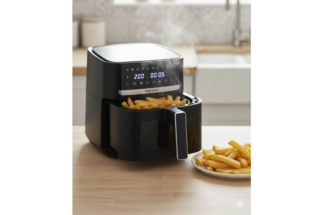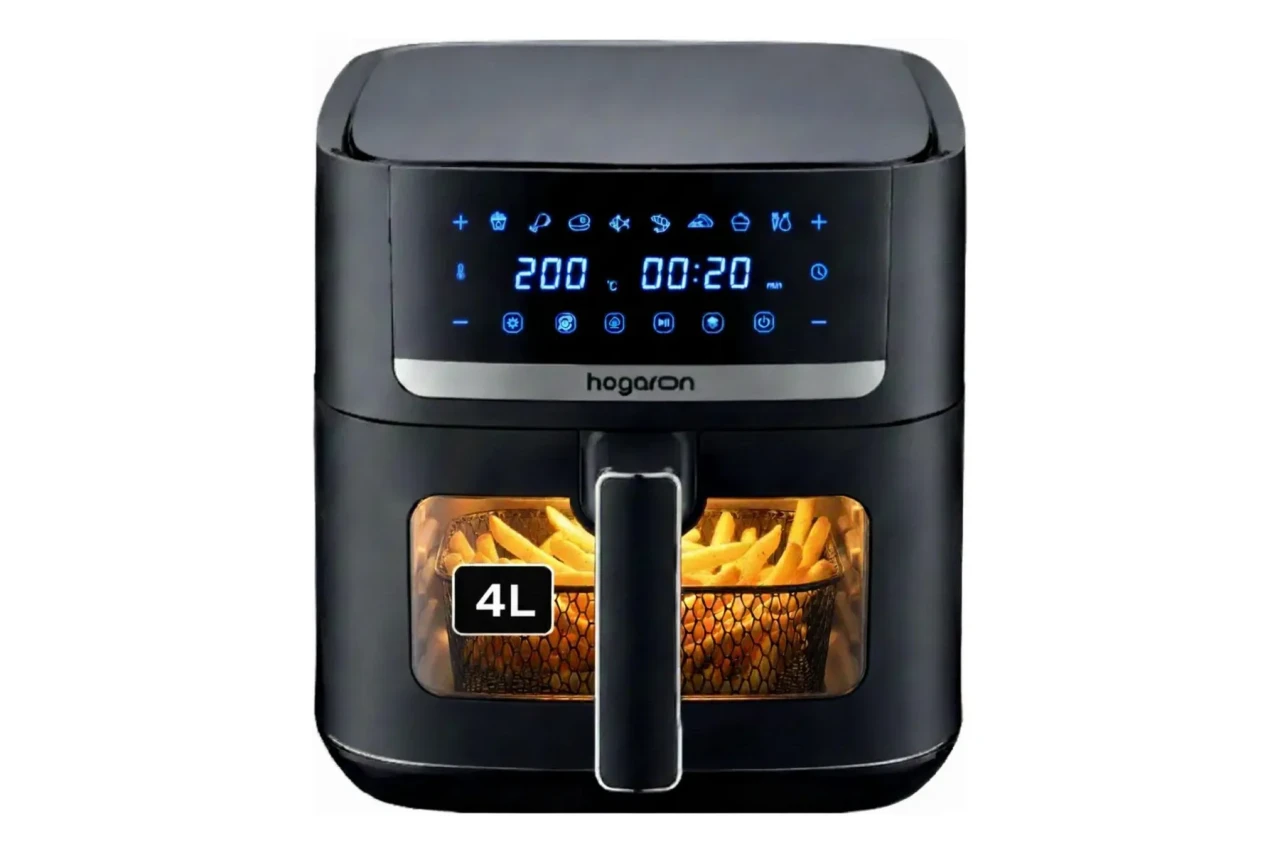 Detalles Técnicos -Potencia 1350W -Capacidad 4L -Temperatura ajustable de 80 a 200°C -Cocina saludable, menos grasa, reduce un 80% la cantidad de aceite -Fácil de limpiar -Versatilidad total -Ventana visible -8 programas preestablecidos -Panel digital LCD -Tecnología de circulación de aire 360° -Protección contra sobrecalentamiento -Mango de toque frío -Con función de calentamiento Cocina más saludable con menos grasa La Freidora de Aire HOGARON de 4 litros te permite preparar comidas deliciosas y crujientes reduciendo hasta un 80% la cantidad de aceite, ideal para quienes buscan una alimentación más saludable sin renunciar al sabor. Potencia y versatilidad para todo tipo de recetas Con 1350W de potencia y 8 programas preestablecidos, esta freidora ofrece resultados perfectos para papas fritas, pollo, vegetales y más. Su temperatura ajustable de 80 a 200°C y la función de calentamiento te dan el control total para cocinar de forma rápida y uniforme. Diseño práctico y seguro Equipada con panel digital LCD y ventana visible, te permite monitorear tus preparaciones sin necesidad de abrir el cesto. Además, cuenta con mango de toque frío y protección contra sobrecalentamiento para un uso seguro en todo momento. Su tecnología de circulación de aire 360° y su diseño de piezas desmontables la hacen fácil de limpiar.